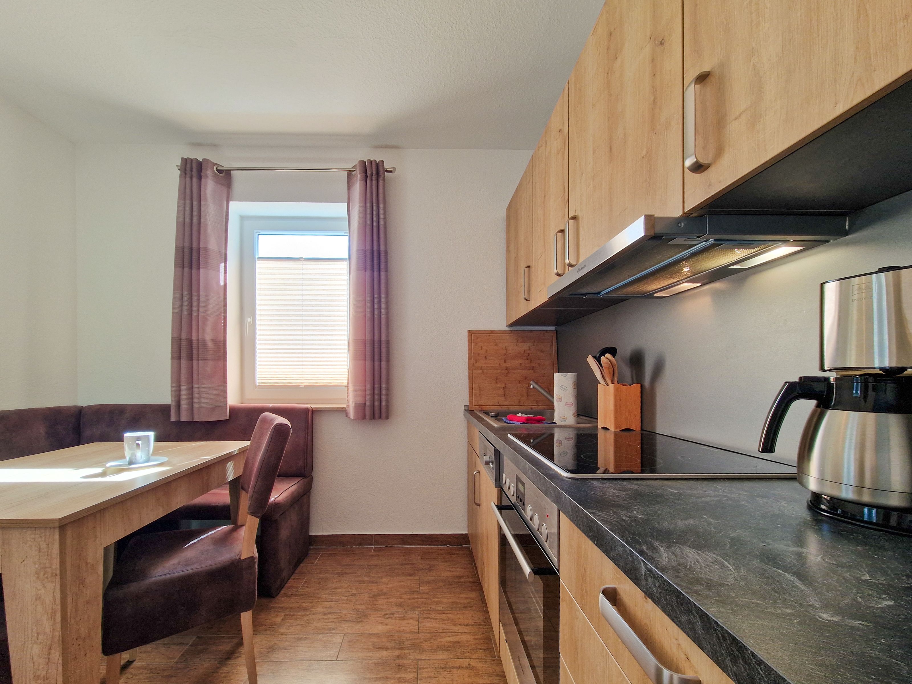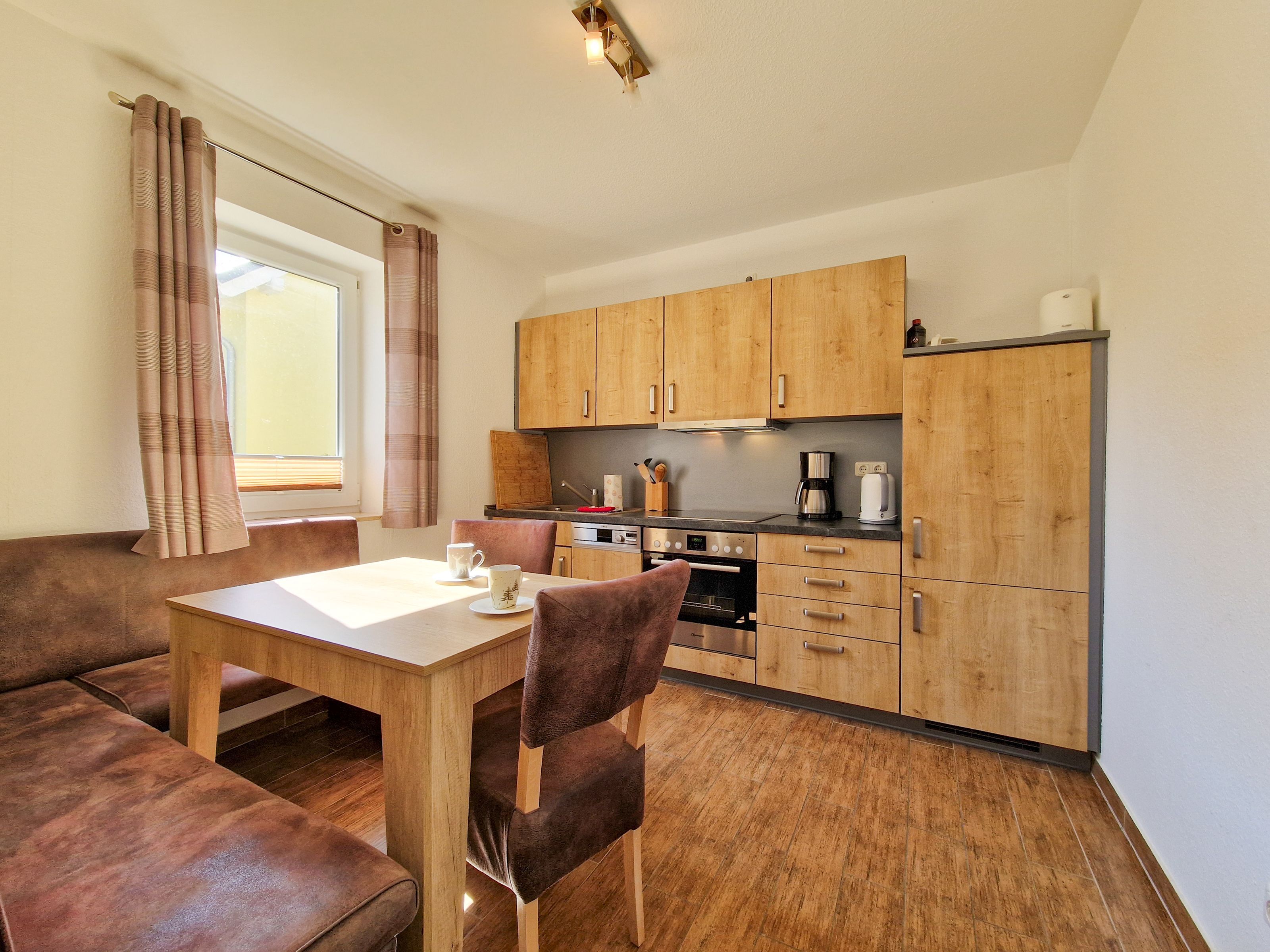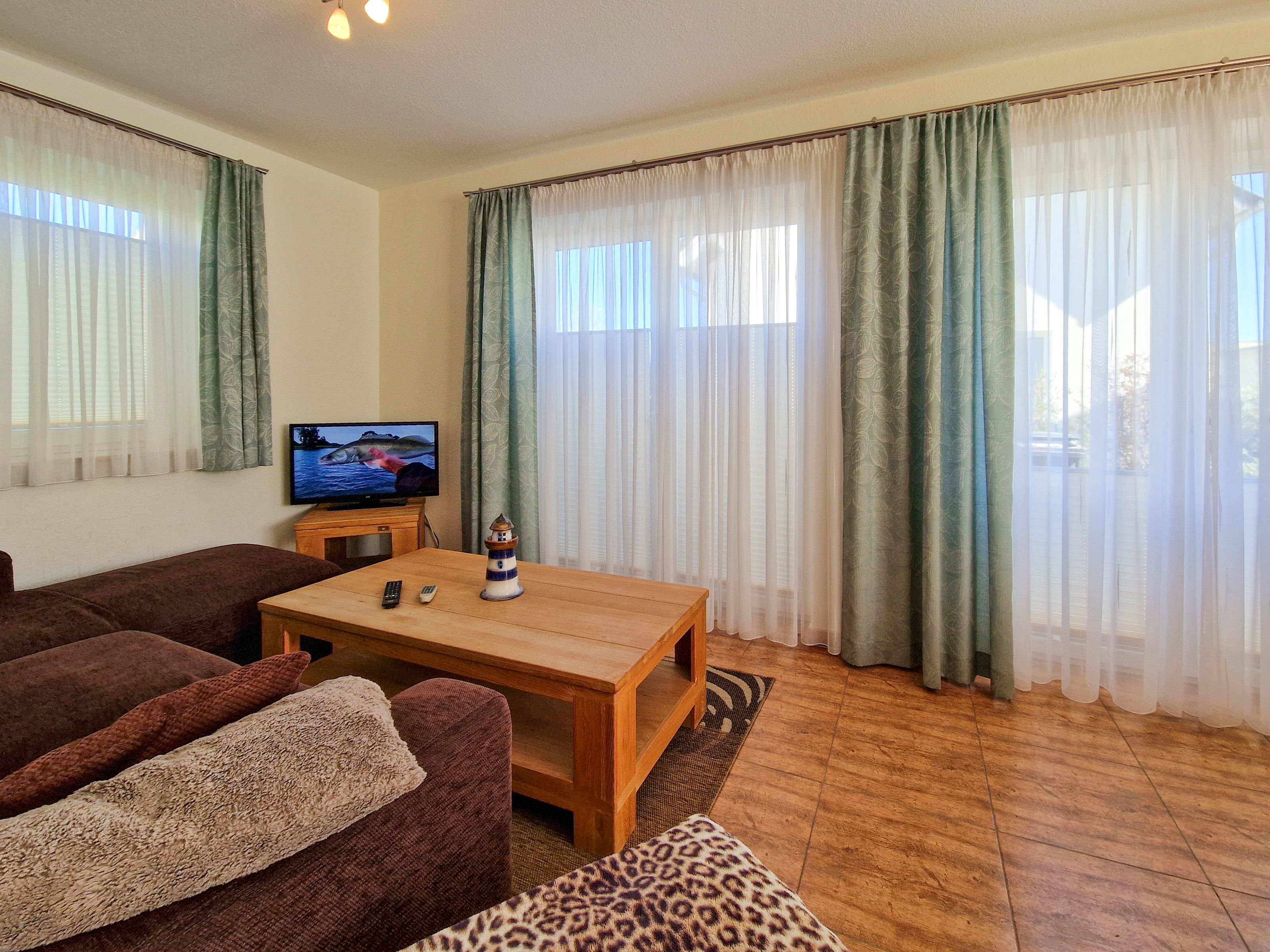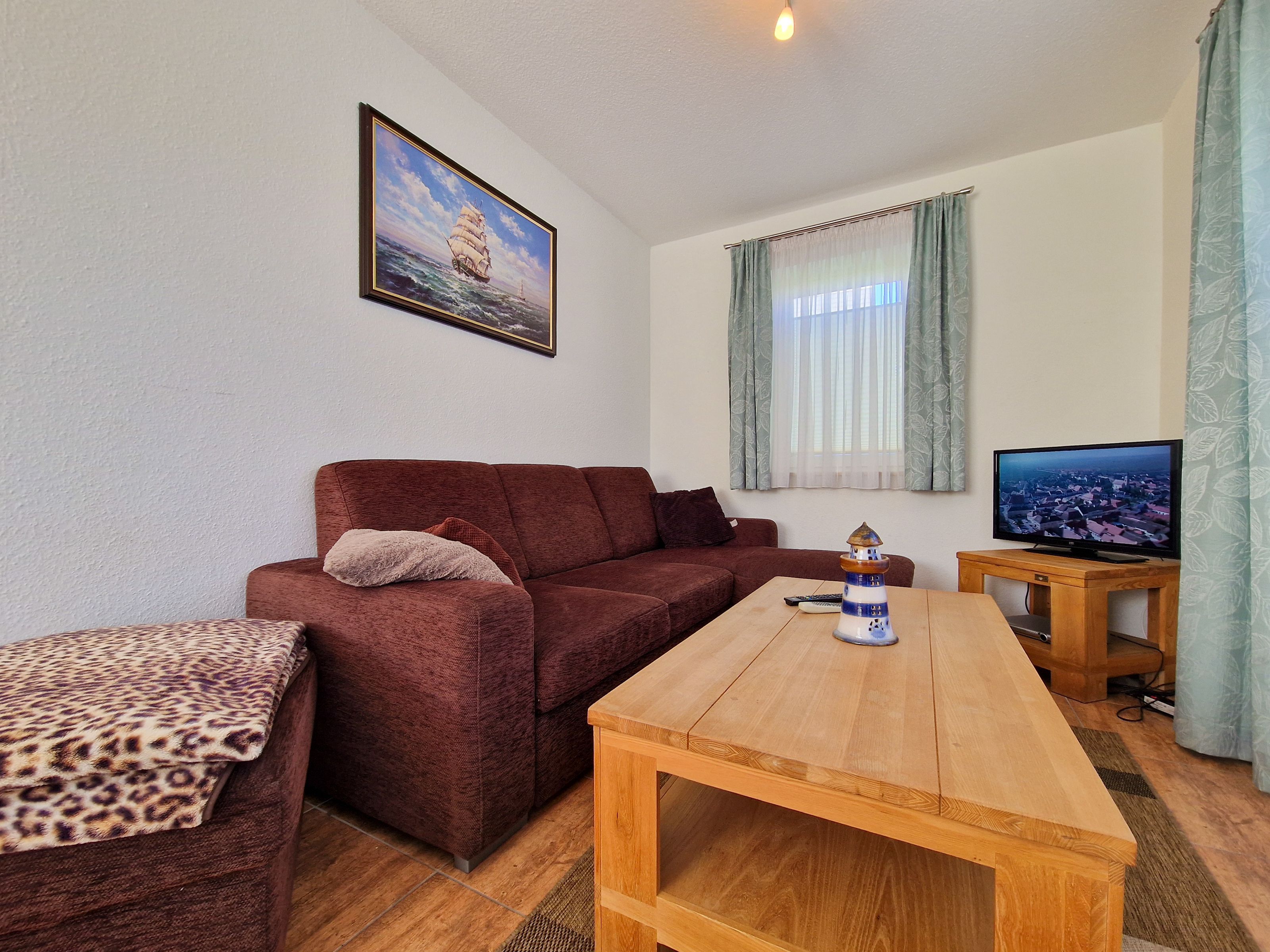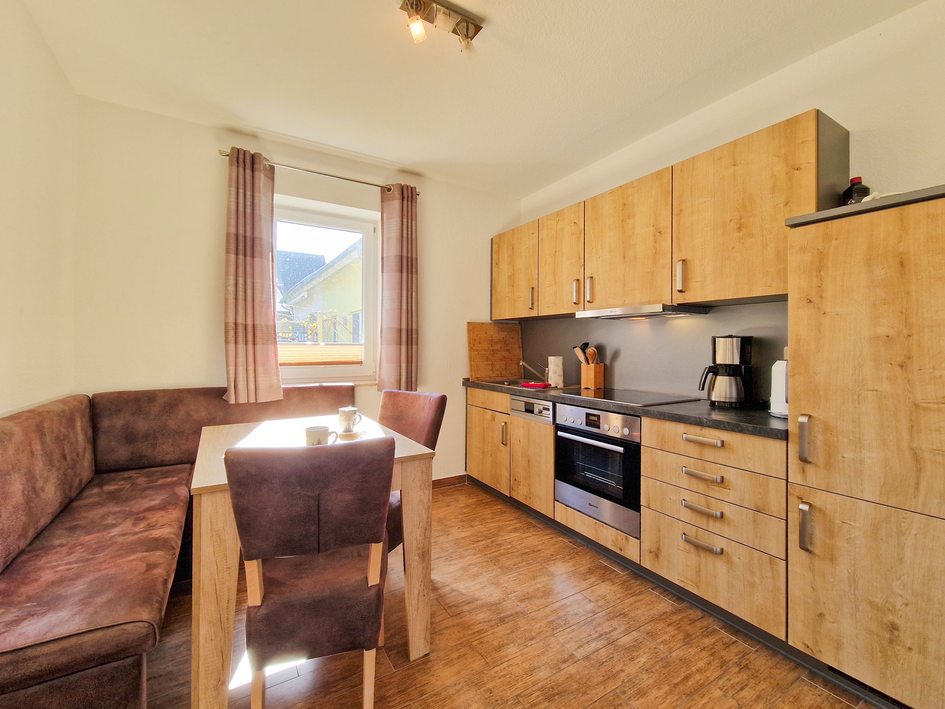 Treten Sie ein in unser gemütliches Ferienhaus „Zur Reling: Vom Flur aus gelangen Sie in den großzügigen Wohnraum mit einer vollständig ausgestatteten Küchenzeile, wo Ihnen ein Herd, ein Ofen, ein Geschirrspüler, eine Kaffeemaschine, ein Wasserkocher und vieles mehr zur Verfügung stehen, damit Sie hier Ihre Lieblingsspeisen zubereiten können. Gemeinsam können Sie am hölzernen Esstisch kulinarische Highlights genießen oder Sie machen es sich auf der bequemen Couch vor dem Flat-TV gemütlich.