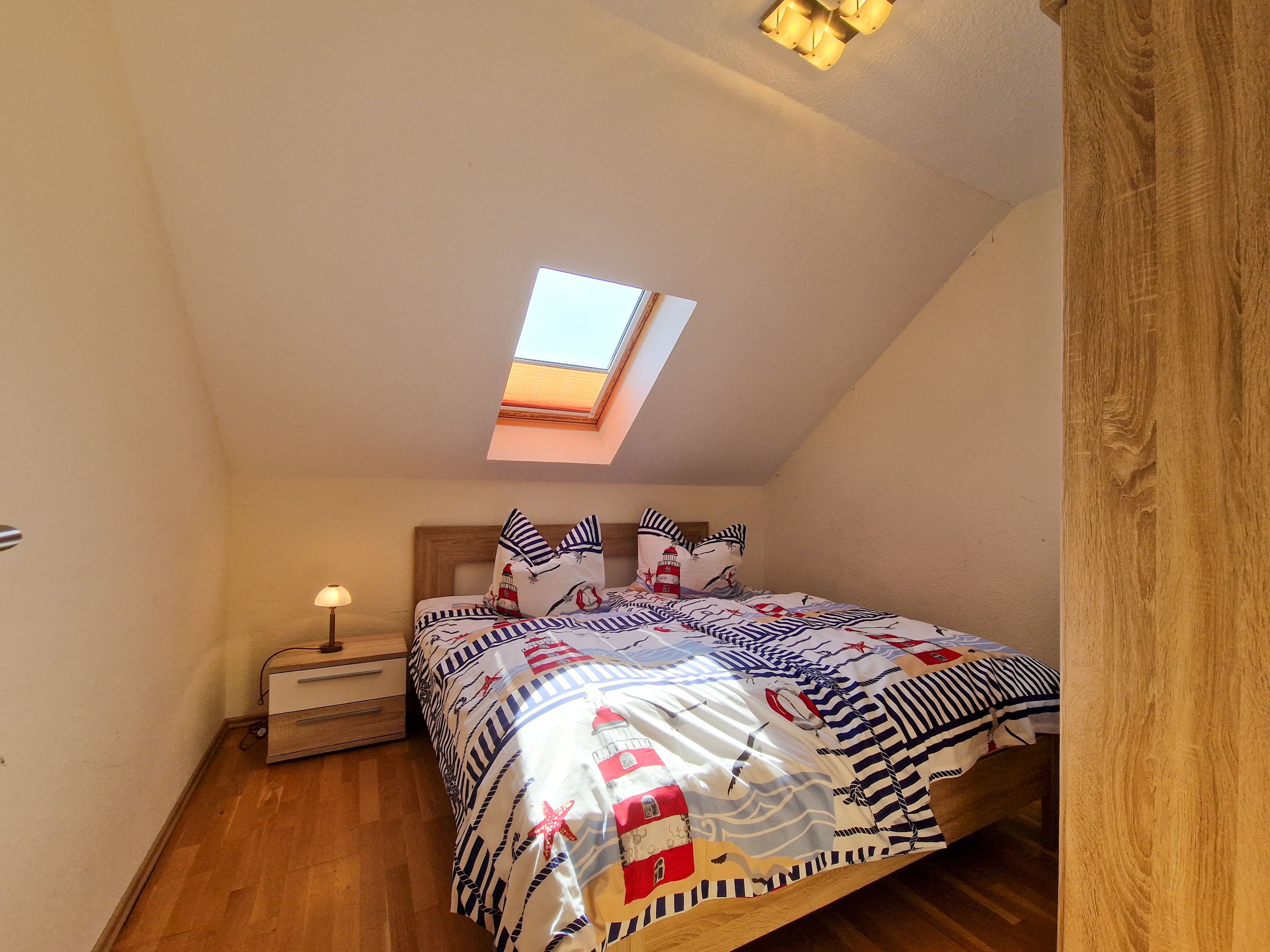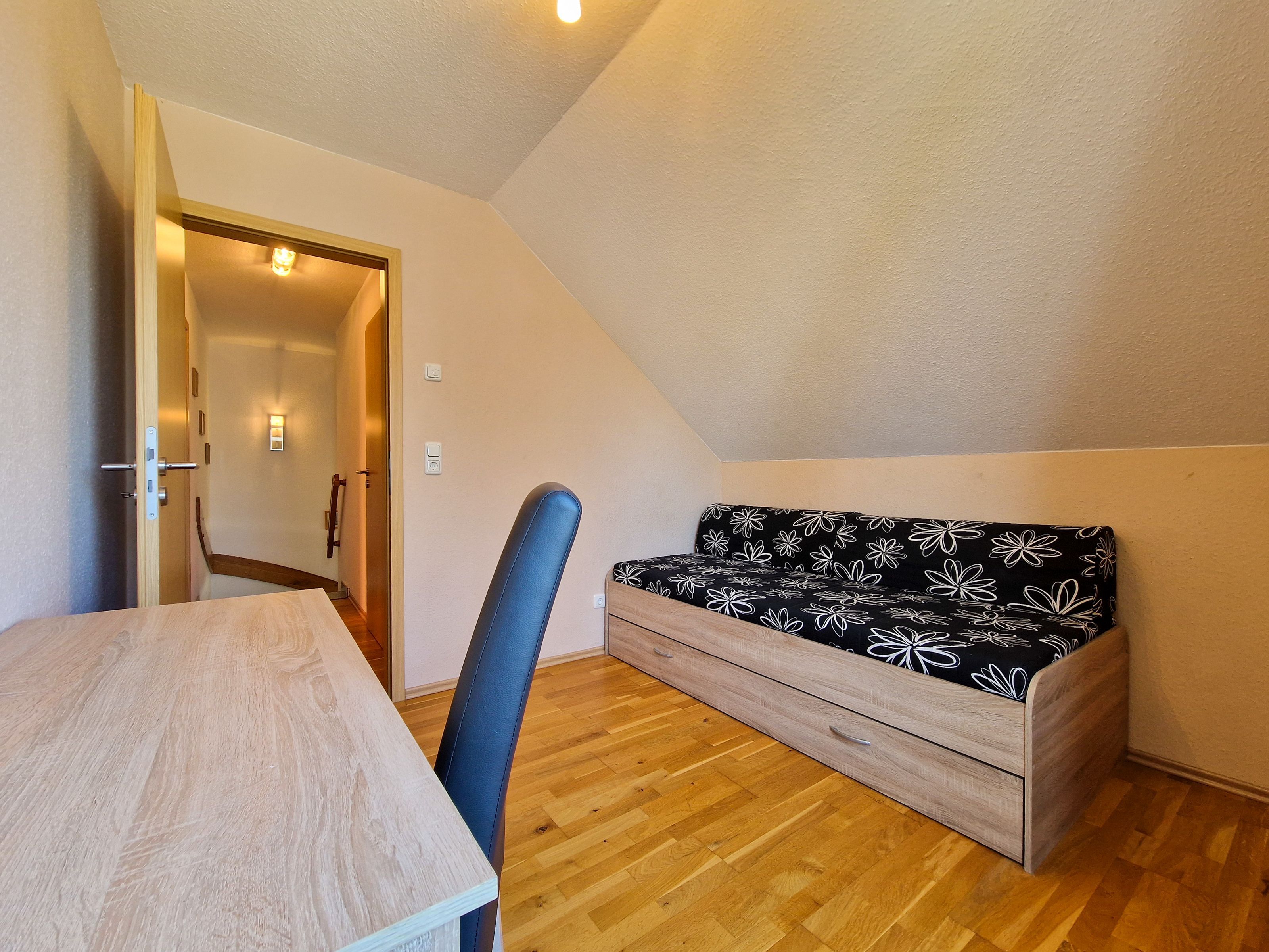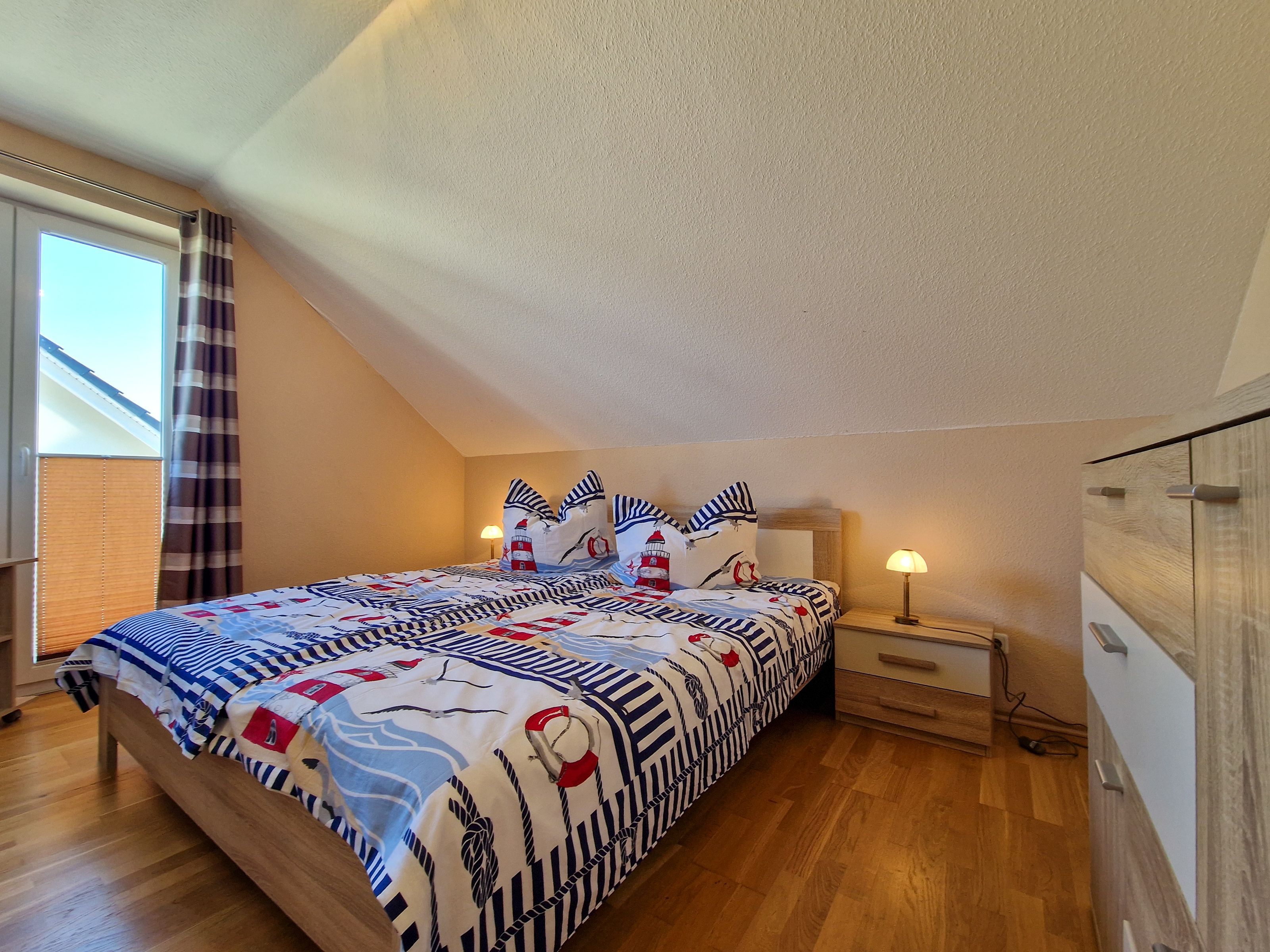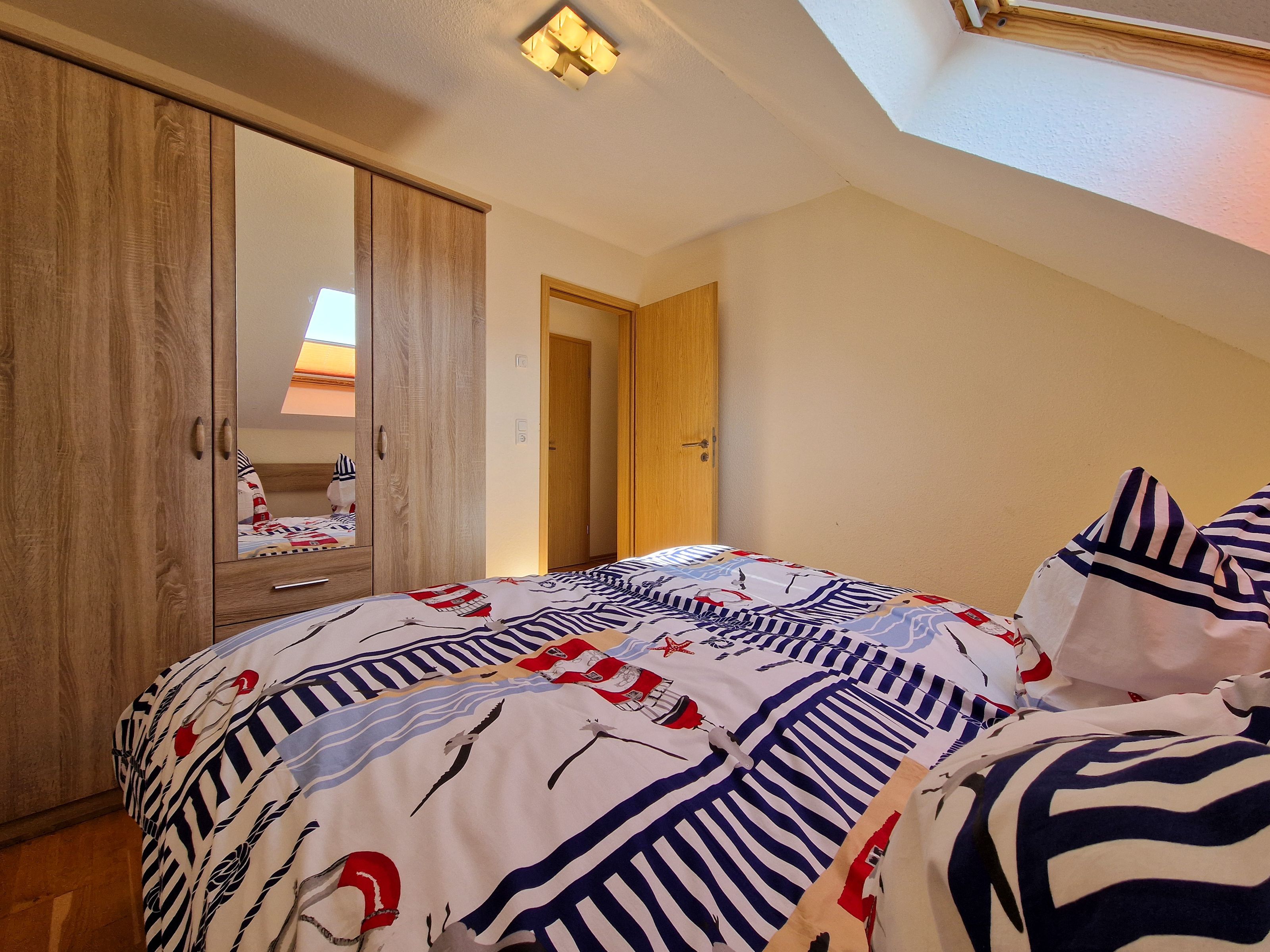 Über eine Treppe erreichen Sie das Obergeschoß des Hauses. Hier befinden sich ein Schlafzimmer mit Doppelbett und Kleiderschrank, ein weiteres Schlafzimmer mit Doppelbett, Kleiderschrank und einem kleinen Fernseher, sowie ein drittes Schlafzimmer mit einer ausziehbaren Schlafcouch und einem Schreibtisch.