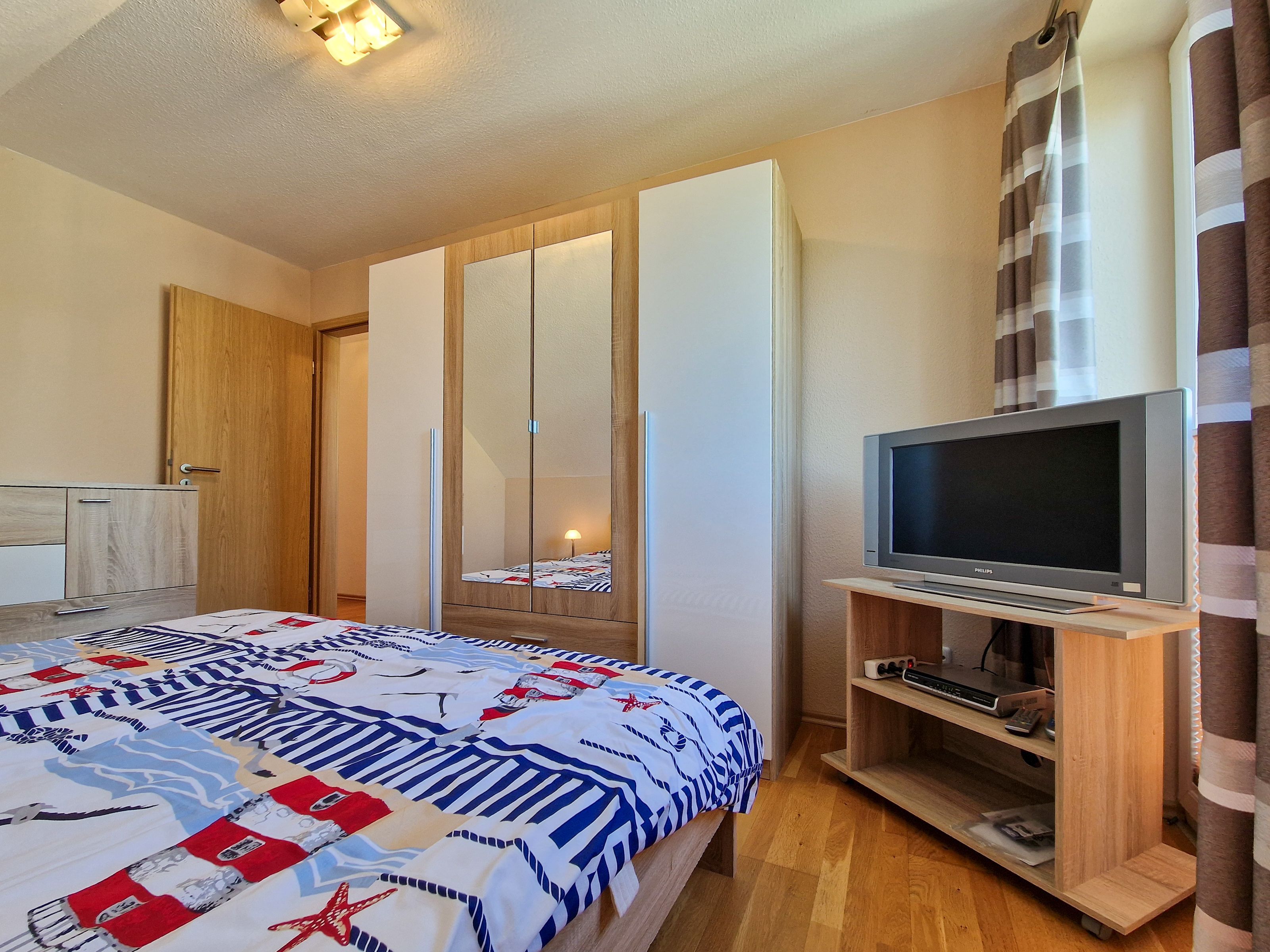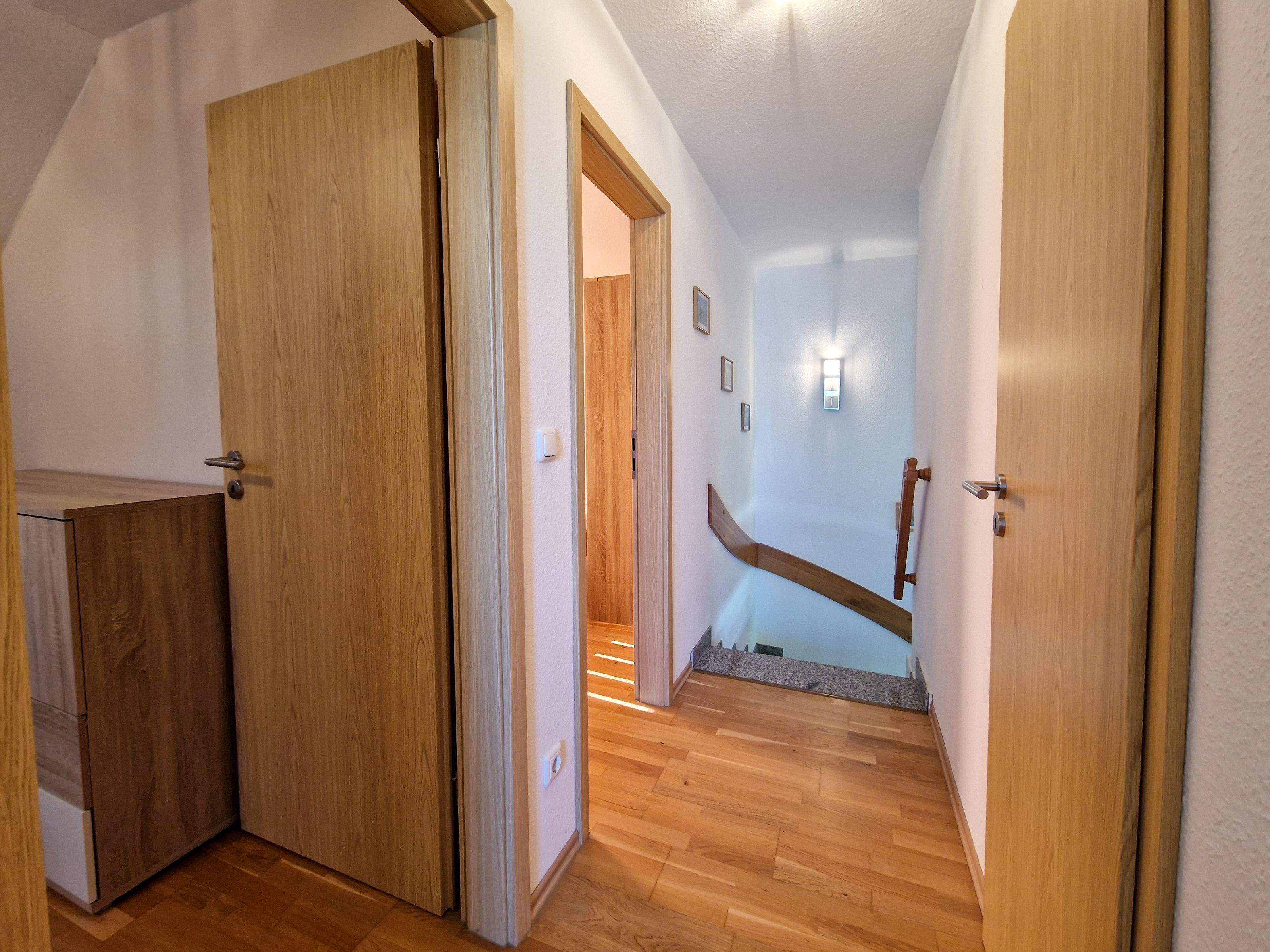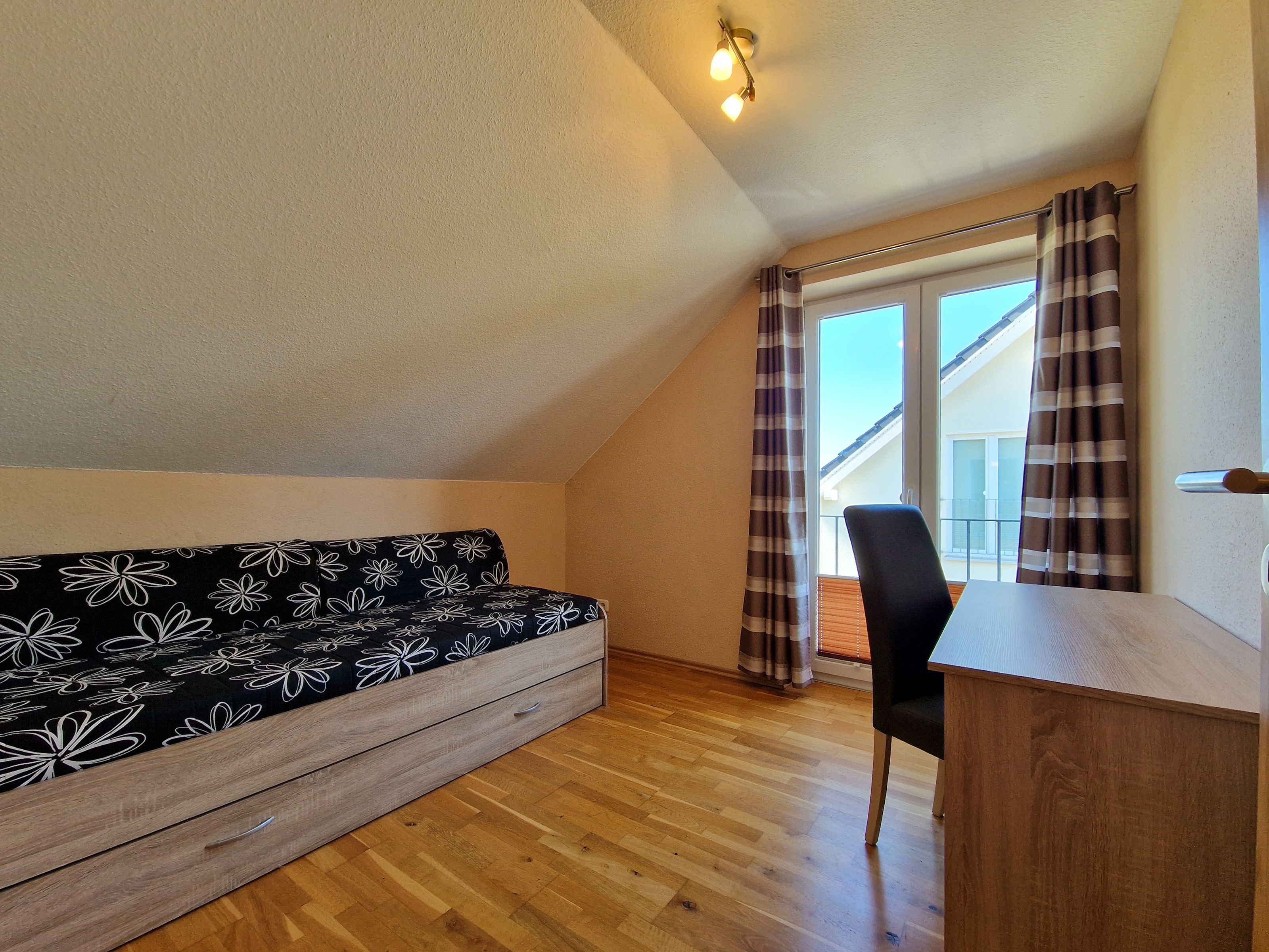 Über eine Treppe erreichen Sie das Obergeschoß des Hauses. Hier befinden sich ein Schlafzimmer mit Doppelbett und Kleiderschrank, ein weiteres Schlafzimmer mit Doppelbett, Kleiderschrank und einem kleinen Fernseher, sowie ein drittes Schlafzimmer mit einer ausziehbaren Schlafcouch und einem Schreibtisch.