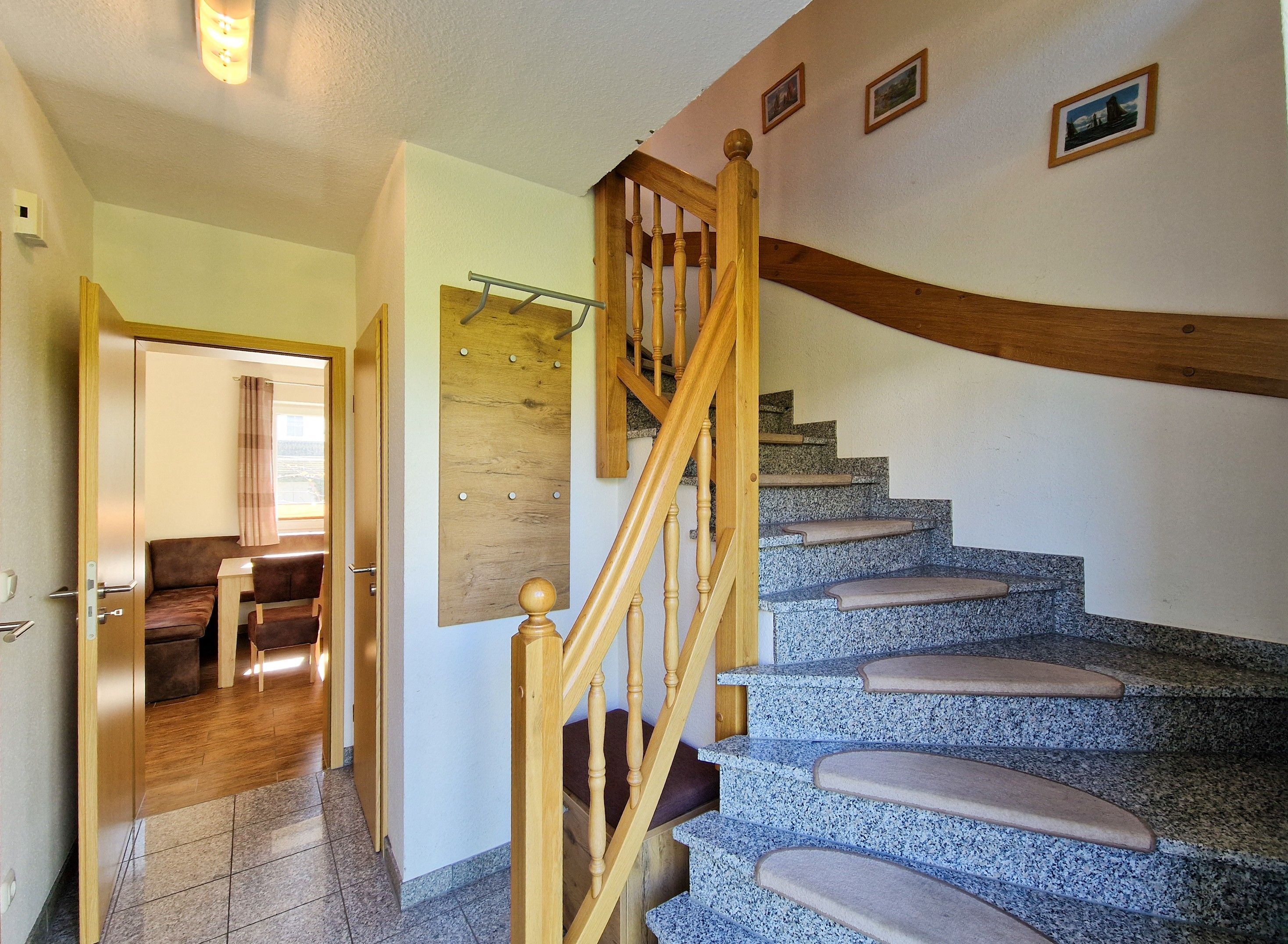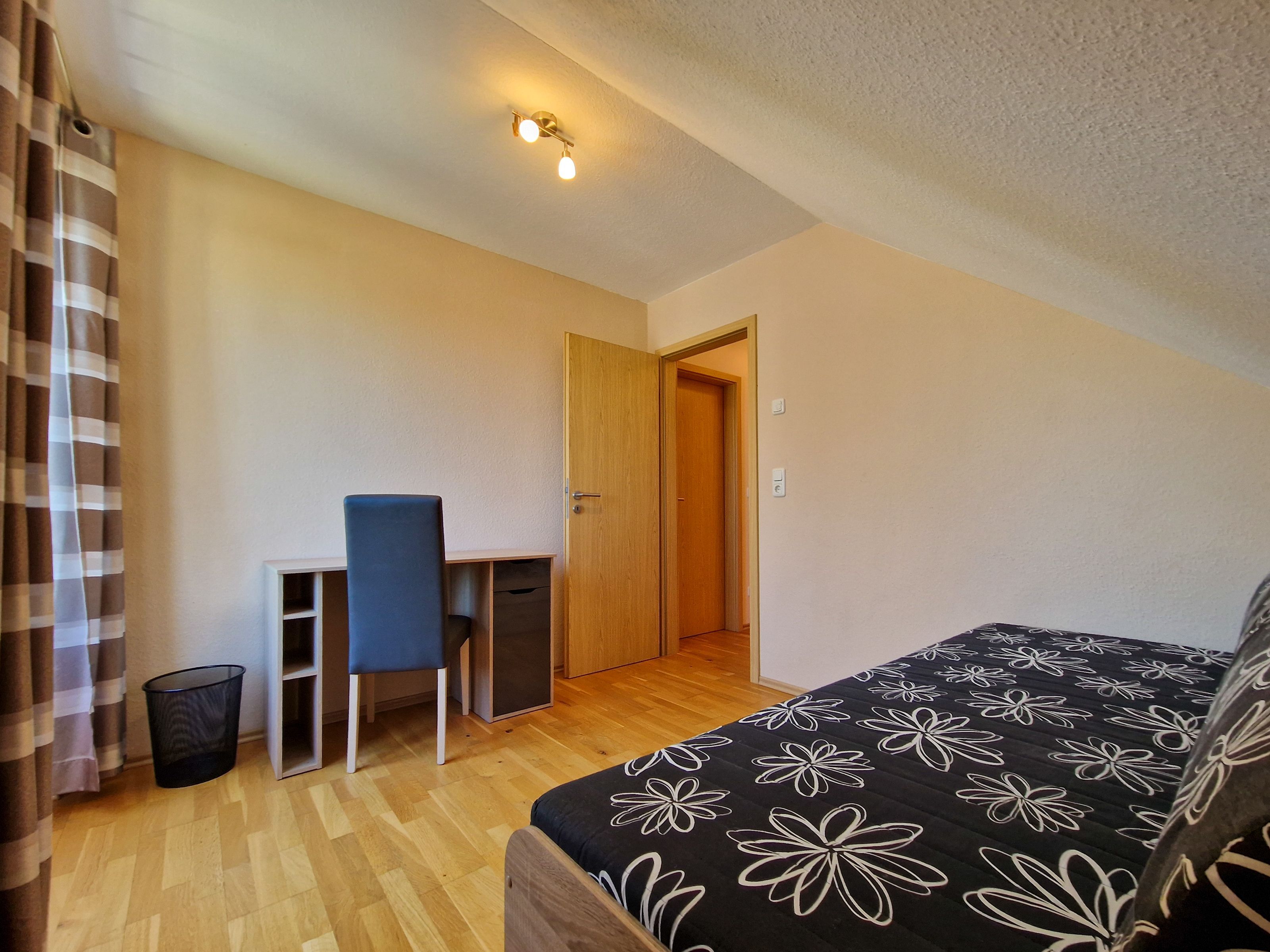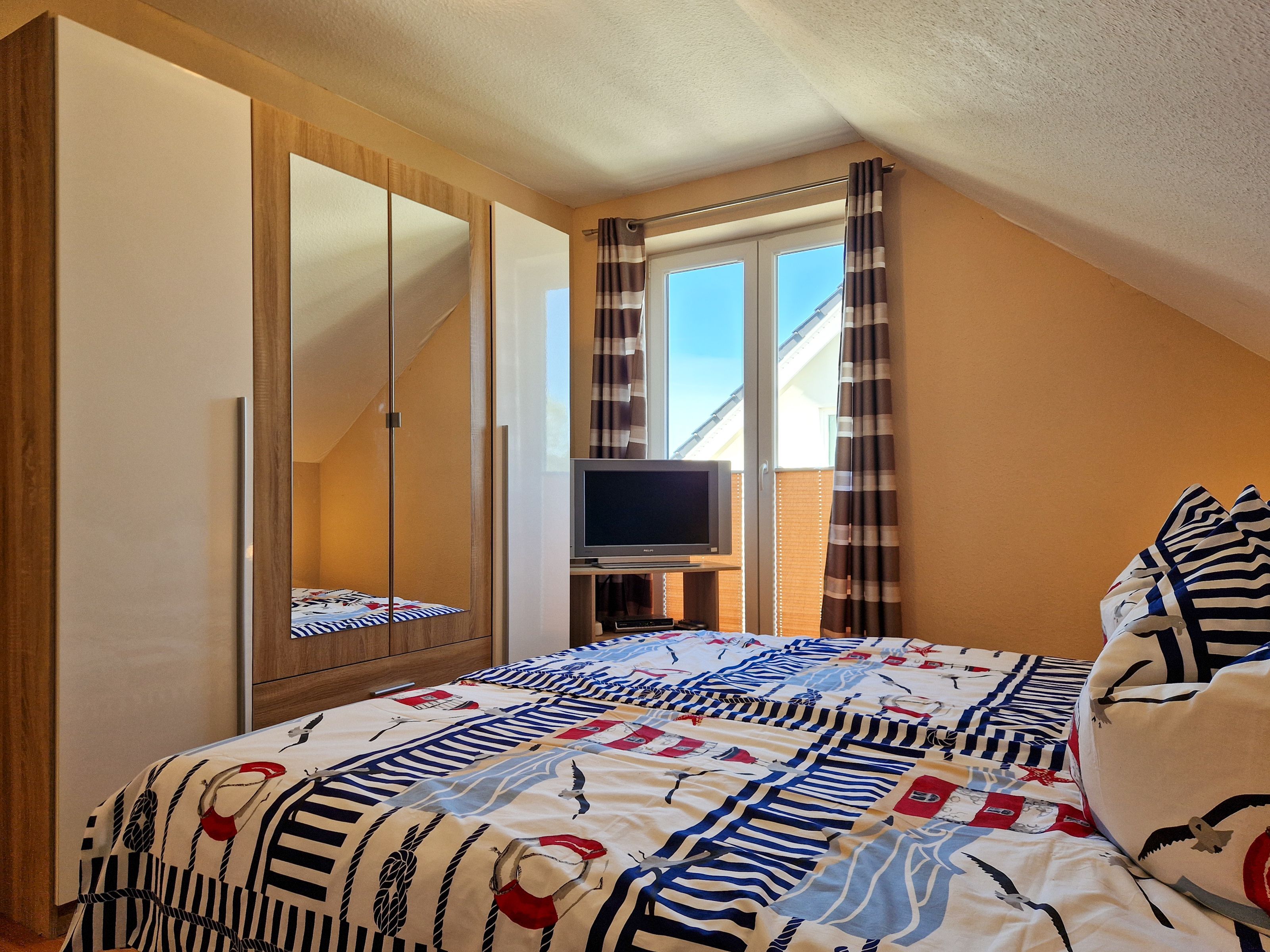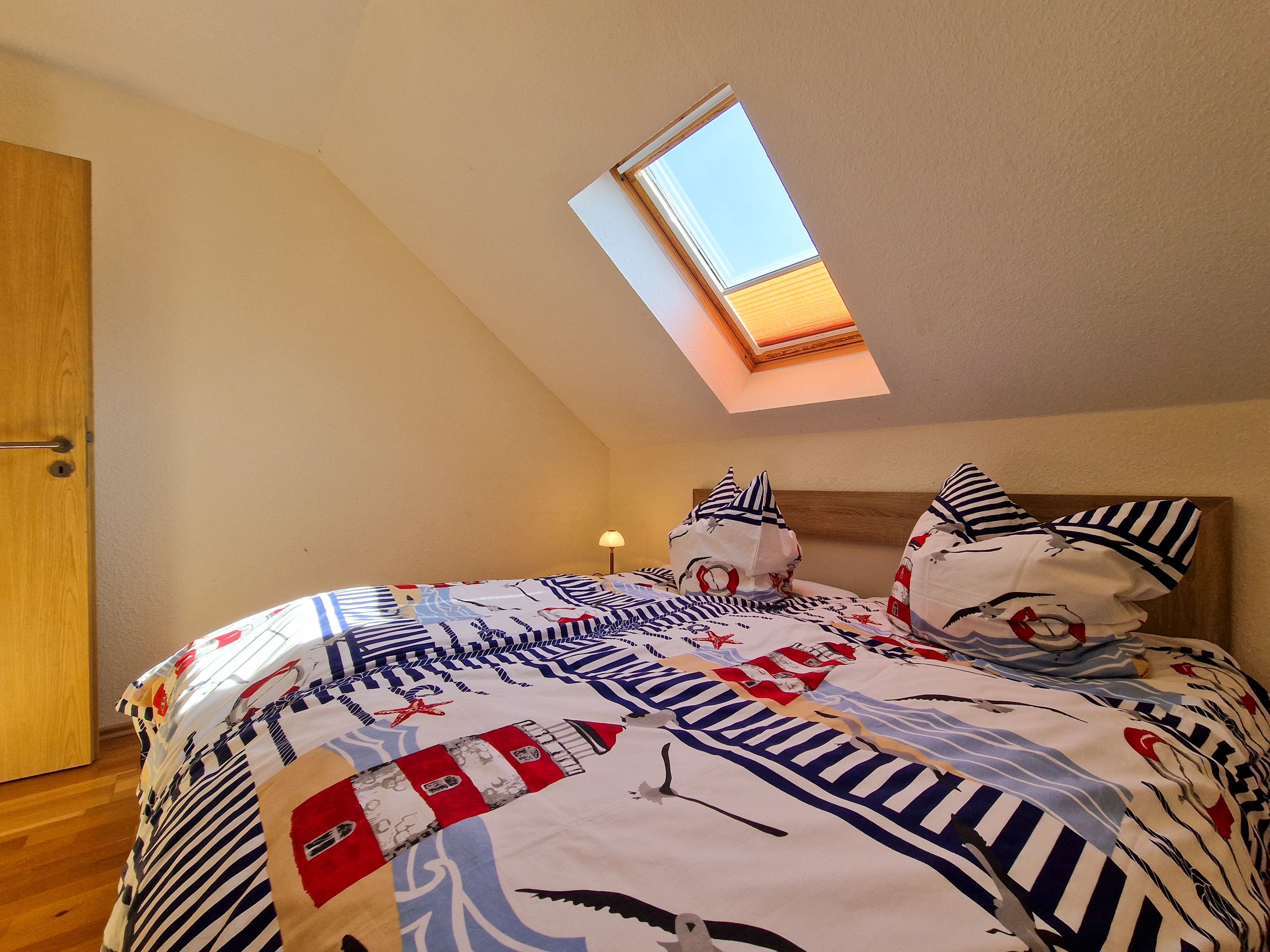 Über eine Treppe erreichen Sie das Obergeschoß des Hauses. Hier befinden sich ein Schlafzimmer mit Doppelbett und Kleiderschrank, ein weiteres Schlafzimmer mit Doppelbett, Kleiderschrank und einem kleinen Fernseher, sowie ein drittes Schlafzimmer mit einer ausziehbaren Schlafcouch und einem Schreibtisch.