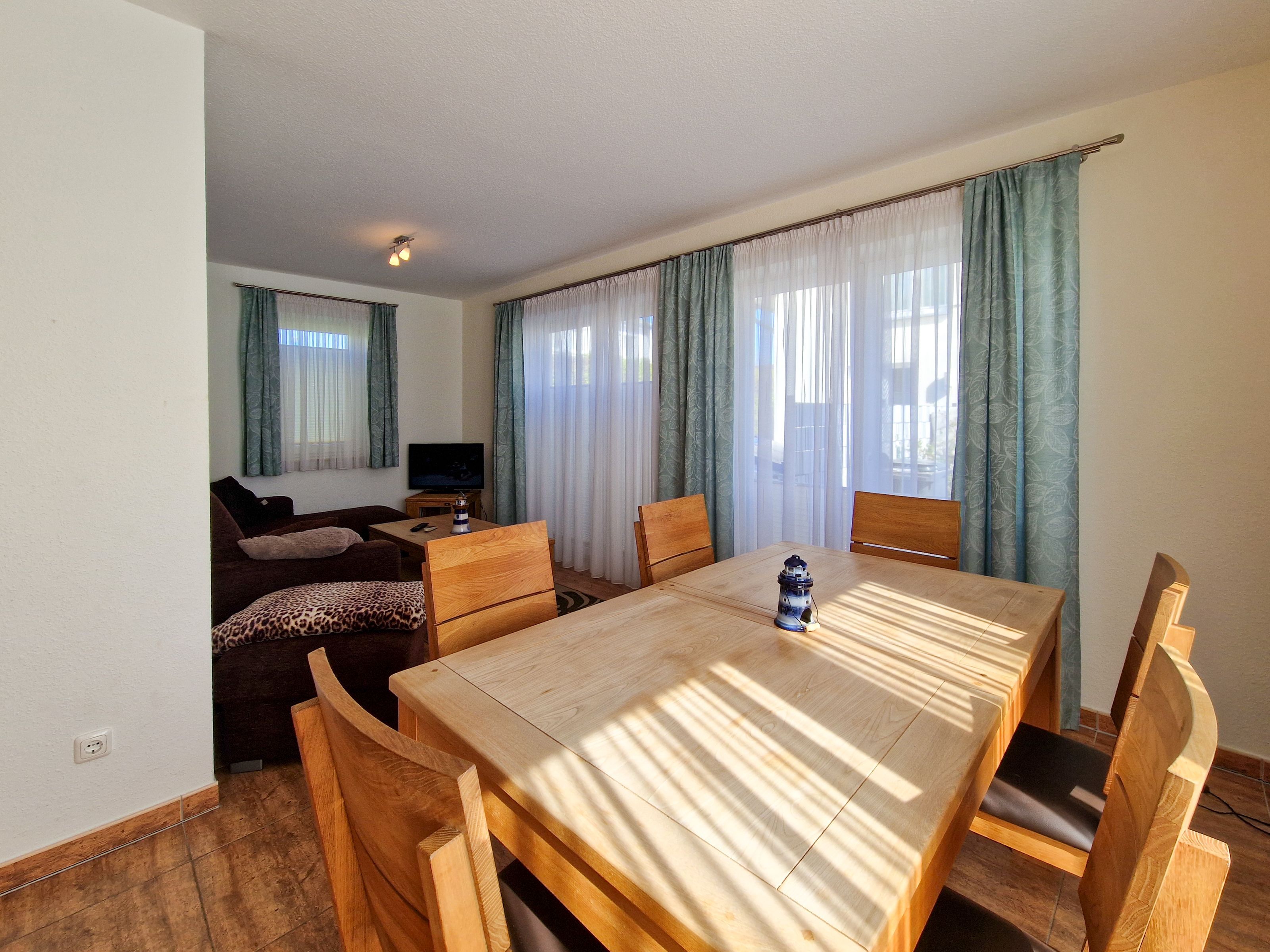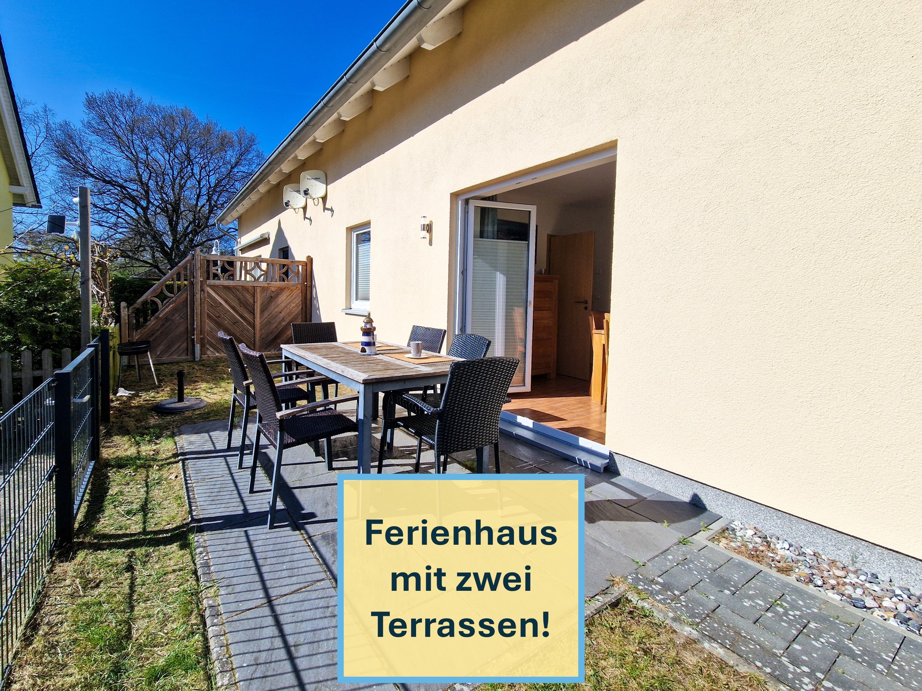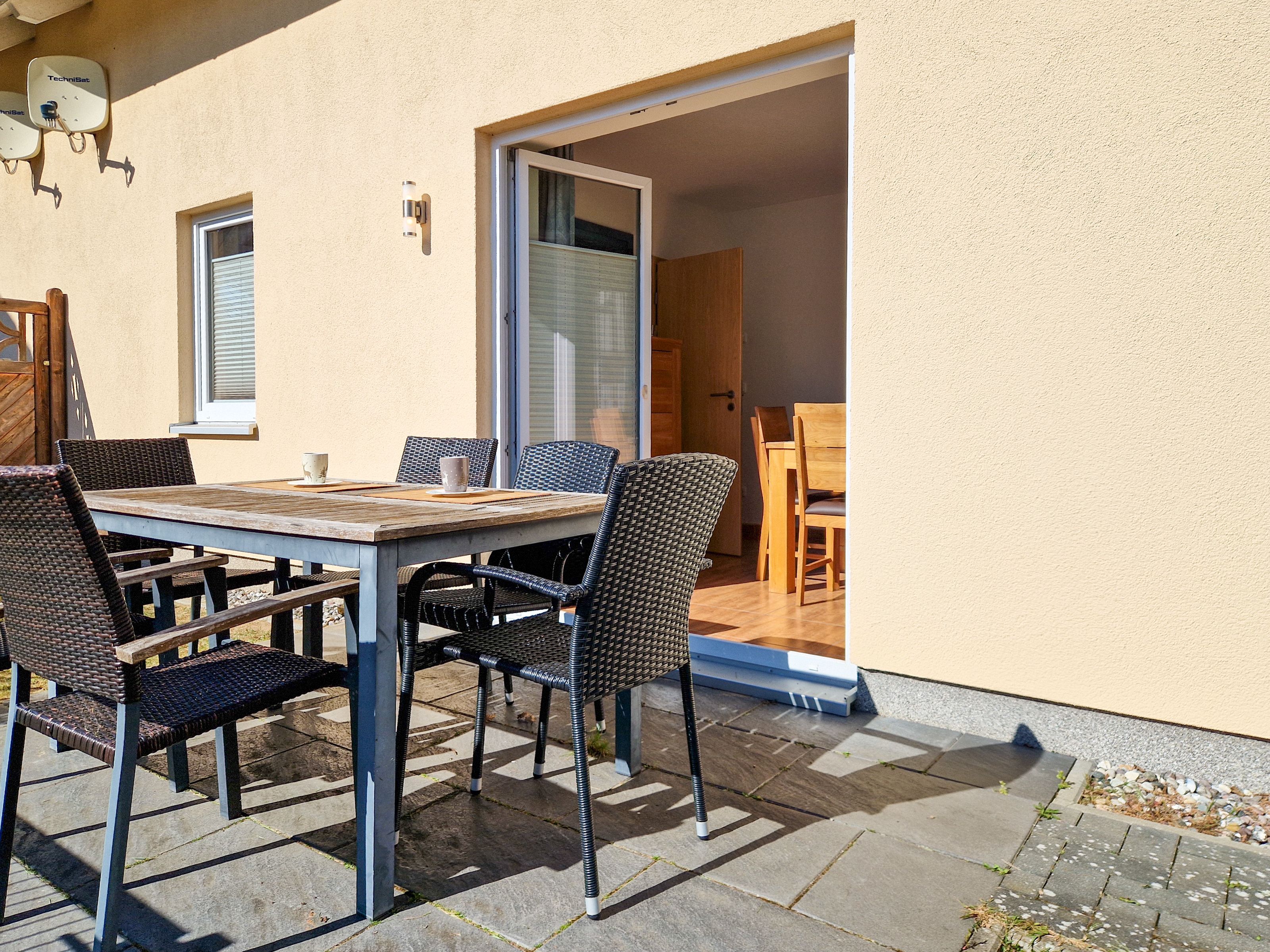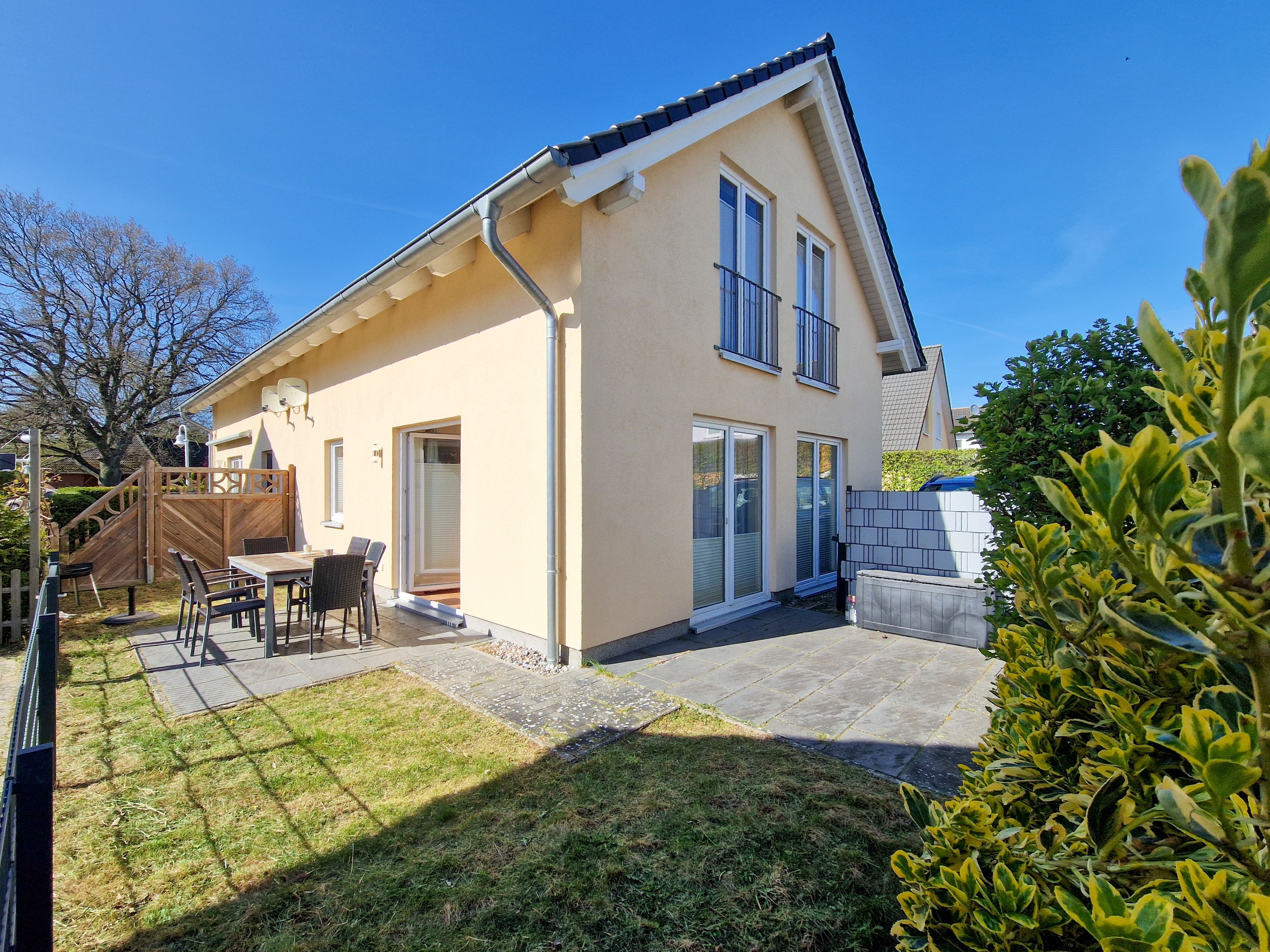 Vom Wohnzimmer aus können Sie auf beide Terrassen treten, wo Sie Sitzmöbel und das herrliche Ostseewetter erwarten. Ein Badezimmer mit Dusche, WC und Waschbecken befindet sich ebenfalls im Erdgeschoß.