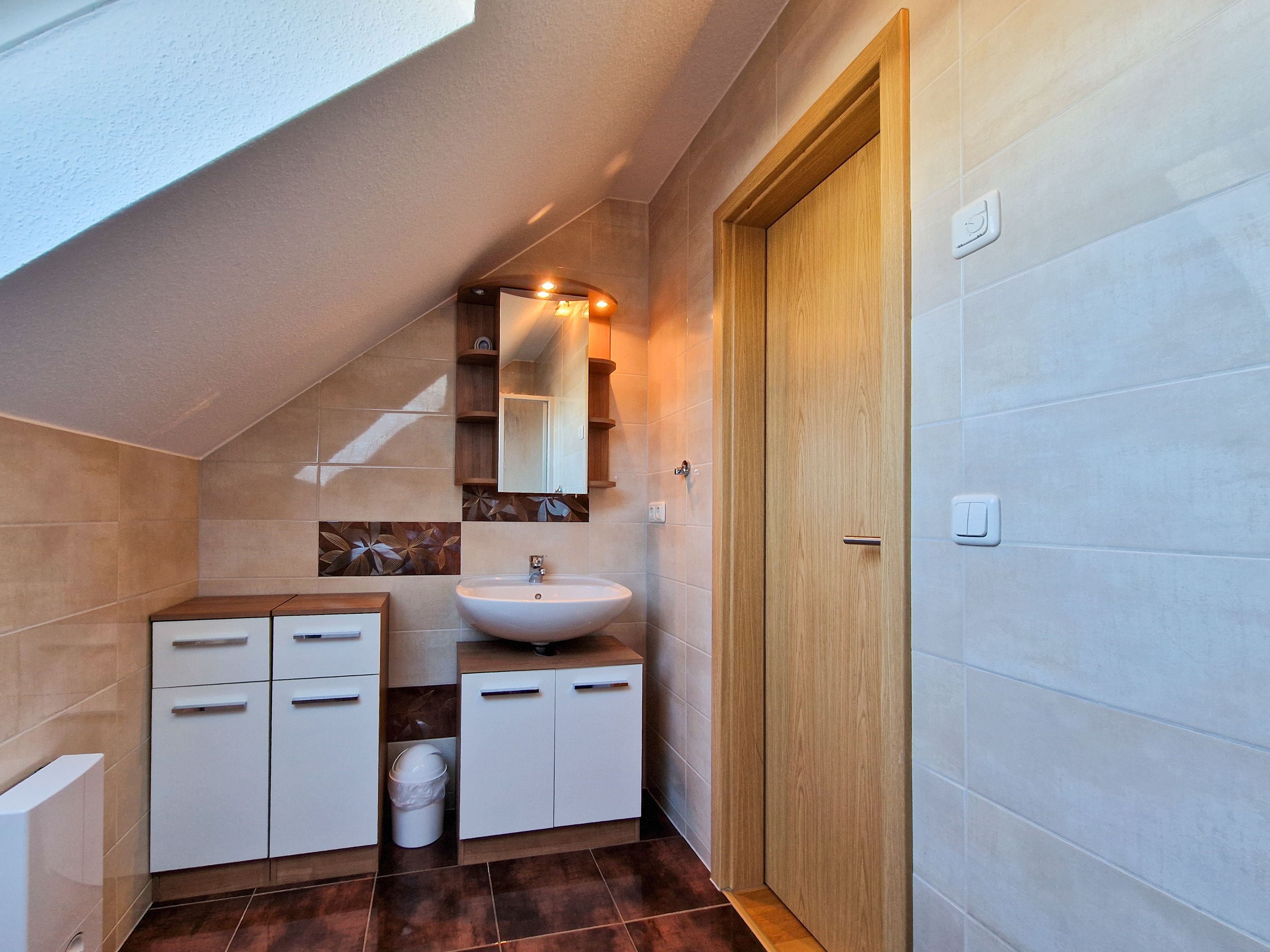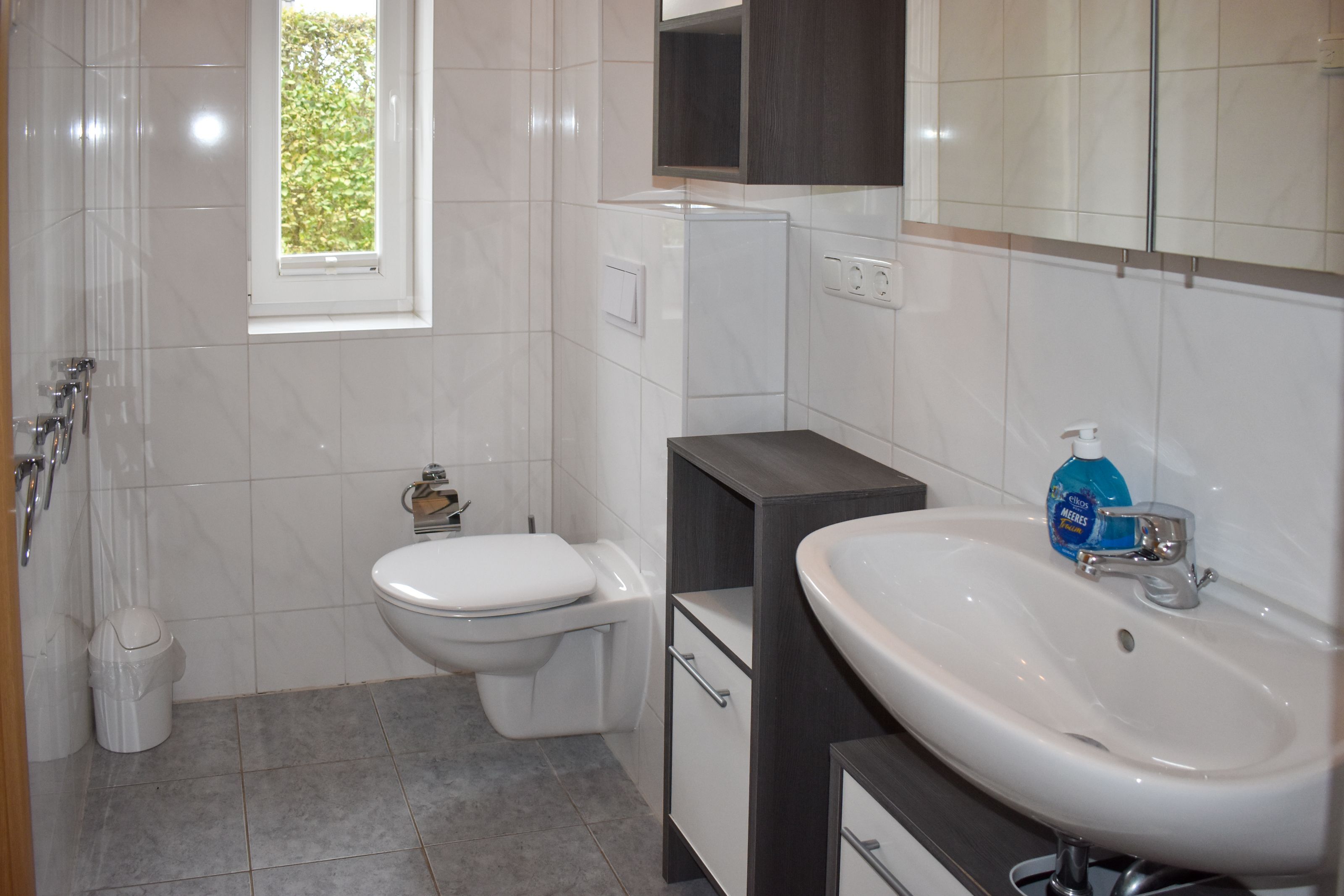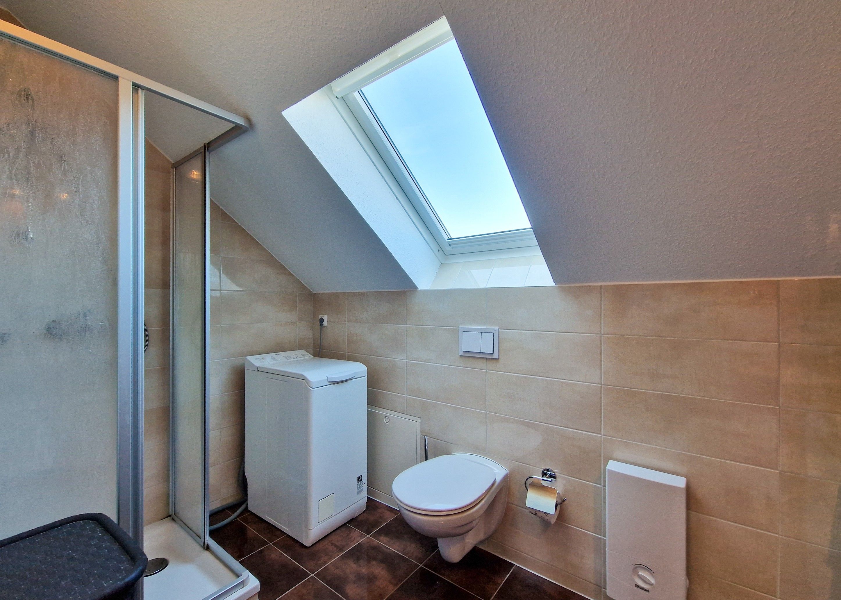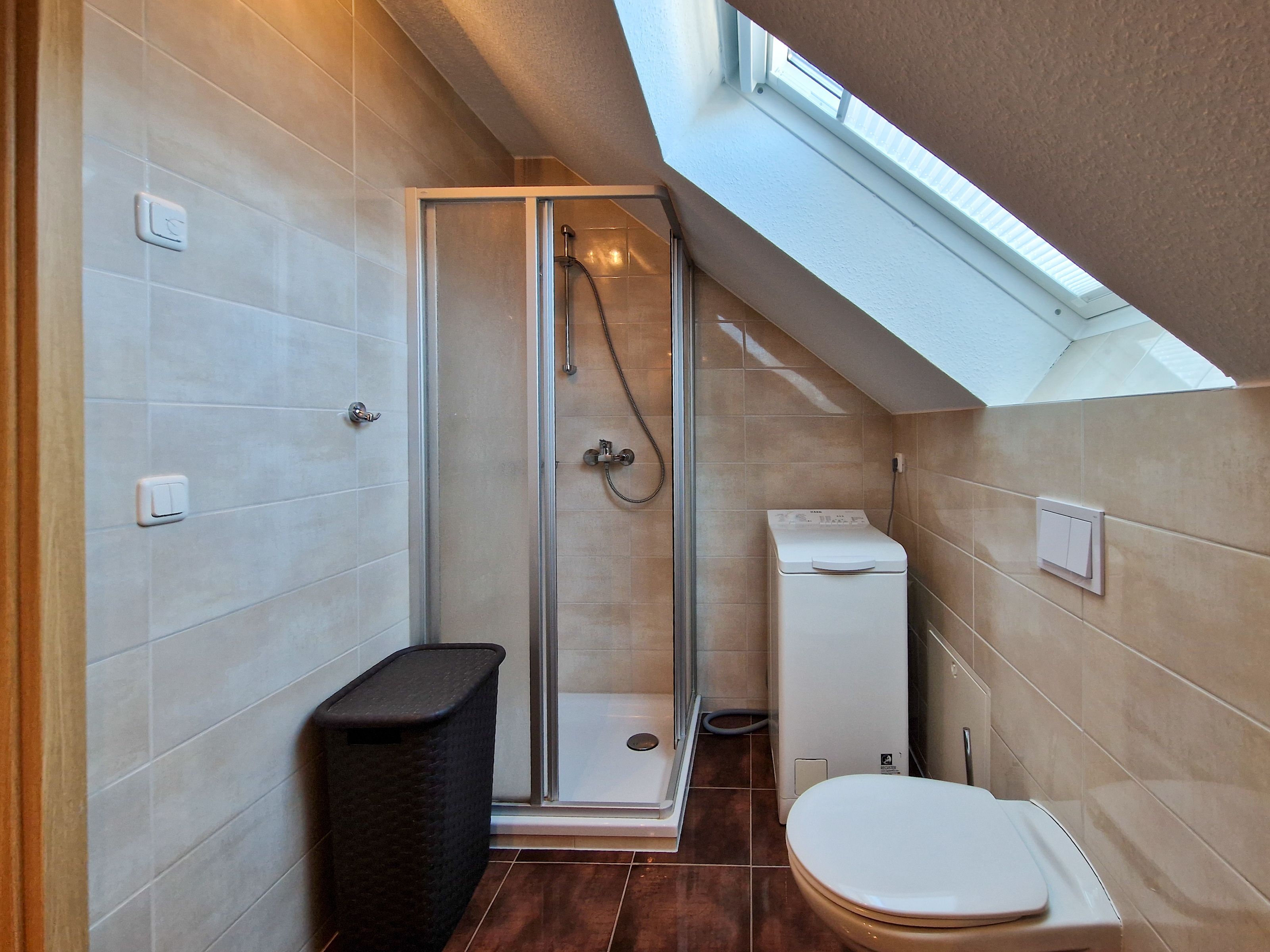 Damit früh niemand anstehen muss gibt es im Obergeschoß zudem ein zweites Badezimmer mit Dusche, WC, Waschbecken und reichlich Abstellmöglichkeiten. Sollten Sie sich länger auf der Insel aufhalten, können Sie die Waschmaschine im oberen Badezimmer benutzen.