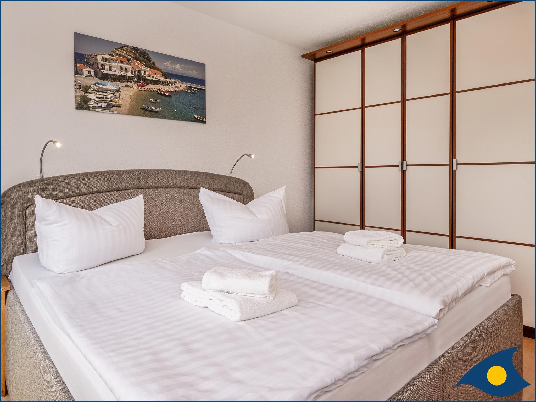 Das separate Schlafzimmer verfügt über ein hohes Bett (mit grossem Stauraum durch Bettkästen), Bettleuchten, Nachttische und einem grossen, geräumigen Schrank sowie einem Fernseher und Jalousien.