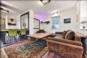 Das Erdgeschoss besticht durch einen offenen, lichtdurchfluteten Wohn- und Essbereich. Auf der gemütlichen Couch können Sie sich entspannen, während ein großer Smart-TV für Unterhaltung sorgt. Die angrenzende, voll ausgestattete Küche mit modernsten Geräten lässt kulinarische Herzen höher schlagen. Ein zusätzliches Badezimmer mit Dusche und Waschmaschine steht ebenfalls zu Ihrer Verfügung.