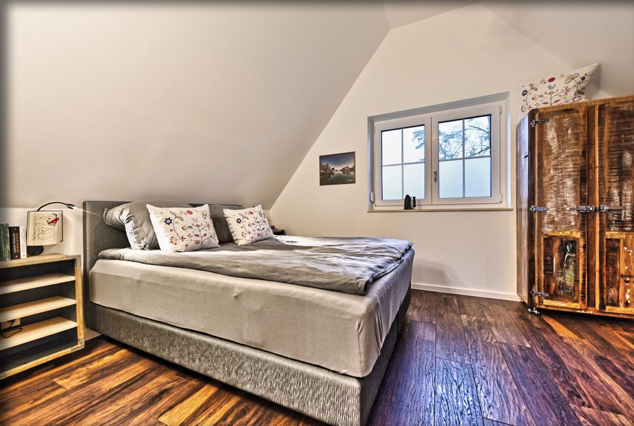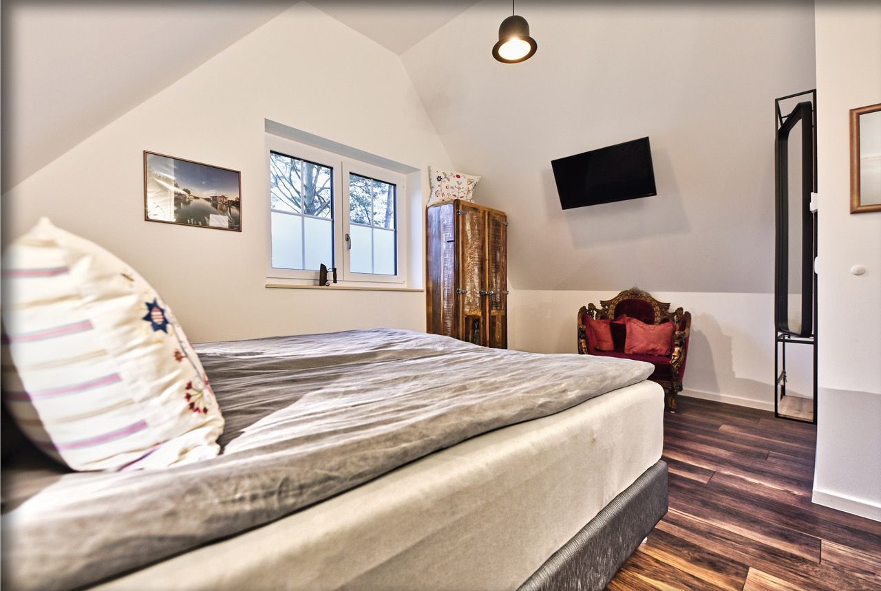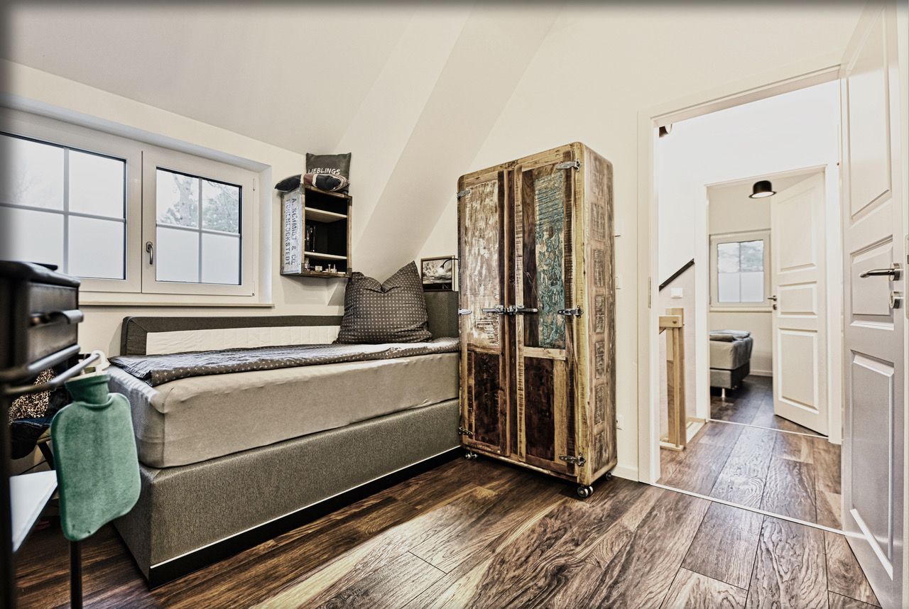 Im Obergeschoss empfängt Sie ein einladendes Schlafzimmer mit einem Doppelbett und einem urigen Kleiderschrank ausreichend Platz für Ihre Urlaubsgarderobe. Ein weiteres Schlafzimmer bietet zwei Einzelbetten mit unterschiedlichen Matratzenhärten, um Ihnen optimalen Schlafkomfort zu gewährleisten. Hier können Sie sich zurücklehnen, fernsehen oder in einem der zahlreichen Bücher schmökern. Dank Außenrollläden lassen sich alle Schlafzimmer komplett verdunkeln, sodass Sie in traumhafte Nächte eintauchen können. Ein modernes Badezimmer mit Badewanne rundet das obere Stockwerk ab.