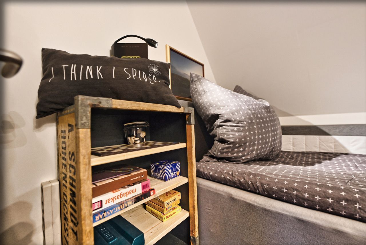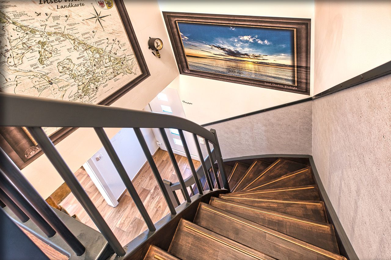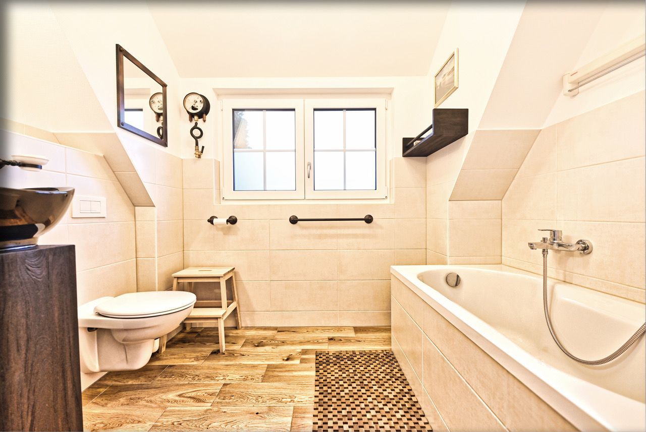 Im Obergeschoss empfängt Sie ein einladendes Schlafzimmer mit einem Doppelbett und einem urigen Kleiderschrank ausreichend Platz für Ihre Urlaubsgarderobe. Ein weiteres Schlafzimmer bietet zwei Einzelbetten mit unterschiedlichen Matratzenhärten, um Ihnen optimalen Schlafkomfort zu gewährleisten. Hier können Sie sich zurücklehnen, fernsehen oder in einem der zahlreichen Bücher schmökern. Dank Außenrollläden lassen sich alle Schlafzimmer komplett verdunkeln, sodass Sie in traumhafte Nächte eintauchen können. Ein modernes Badezimmer mit Badewanne rundet das obere Stockwerk ab.