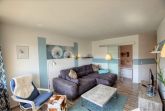 Helles Wohn-Esszimmer mit Ecksofa und Esstisch vor dem Balkon