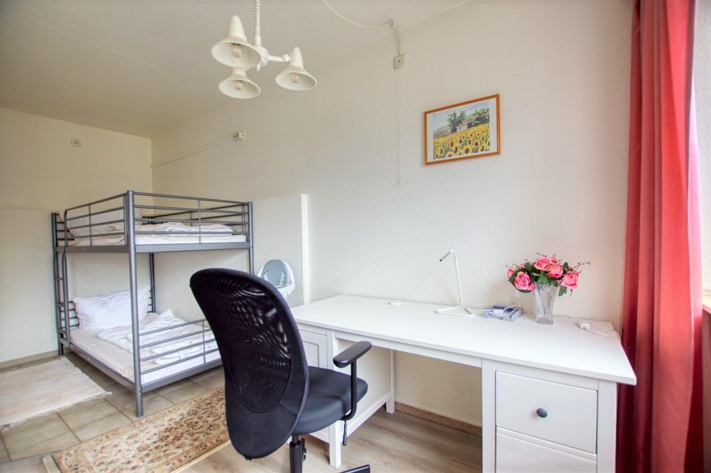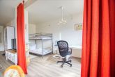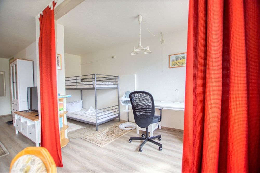 separates Kinderzimmer mit Hochbett, Schreibtisch und Tür zum Wohnzimmer