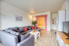 Genießen Sie Ihren Ostseeurlaub in Heiligenhafen in dieser großzügigen 53 m² Ferienwohnung im Haus B des Ferienparks. Die Wohnung liegt in der 2. Etage und bietet einen schönen Blick in den Innenhof. Dank ihrer cleveren Raumaufteilung eignet sie sich ideal für Familien oder bis zu 4 Personen.