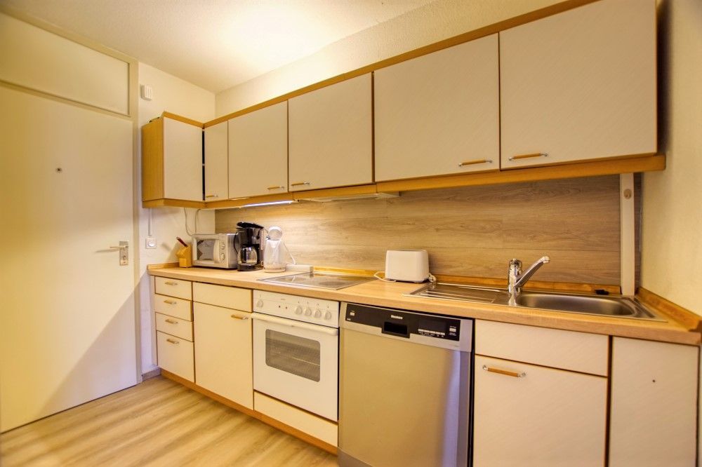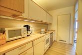komplett ausgestattete Küche mit Geschirrspüler, 4-Plattenherd, Kühlschrank mit Gefrierfach, Mikrowelle, Kaffeemaschine, Wasserkocher, Besteck, Geschirr und Kochutensilien