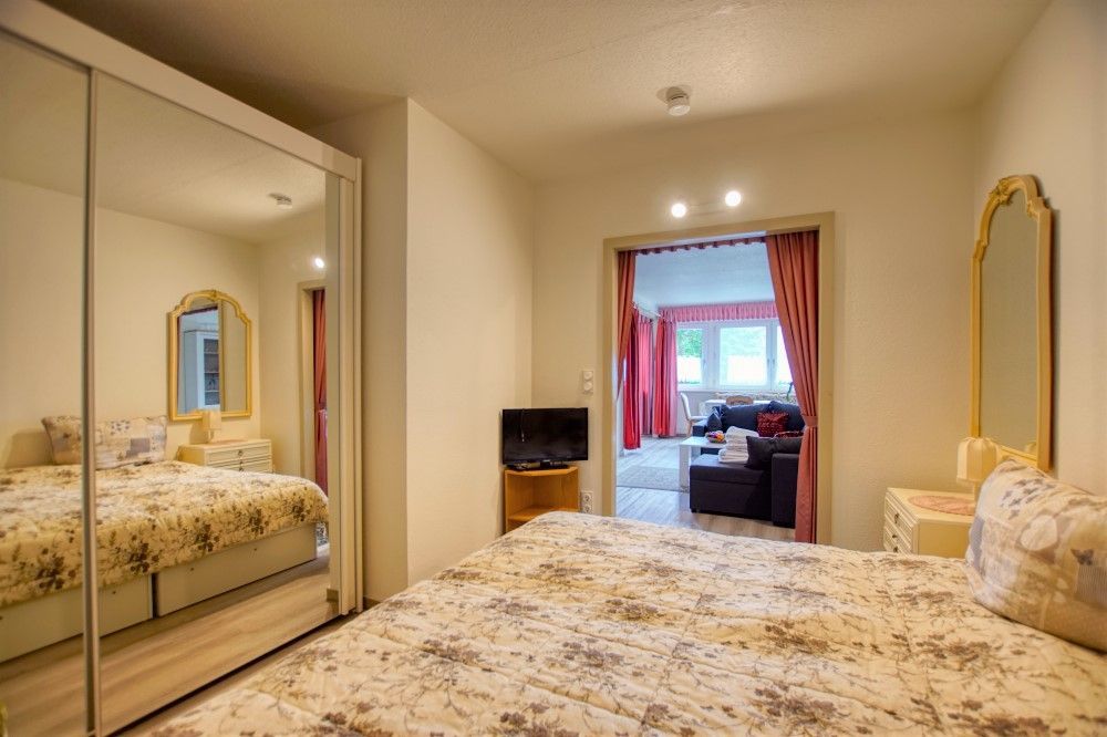 Elternschlafbereich mit Doppelbett und TV, durch Vorhang abtrennbar
