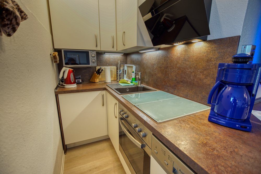 voll ausgestattete Küche mit Geschirrspüler, Backofen, 4-Platten-Ceranfeld, Kopffreihaube, Kühlschrank mit Gefrierfach, Mikrowelle, Kaffeemaschine & Toaster