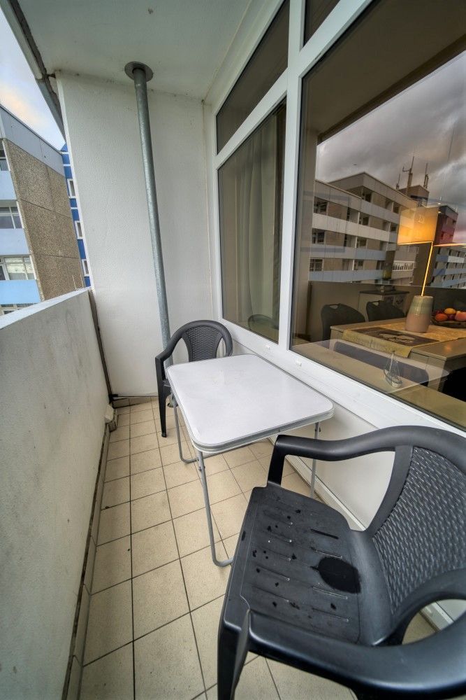 Balkon mit Ausblick auf den Innenhof und den Binnensee