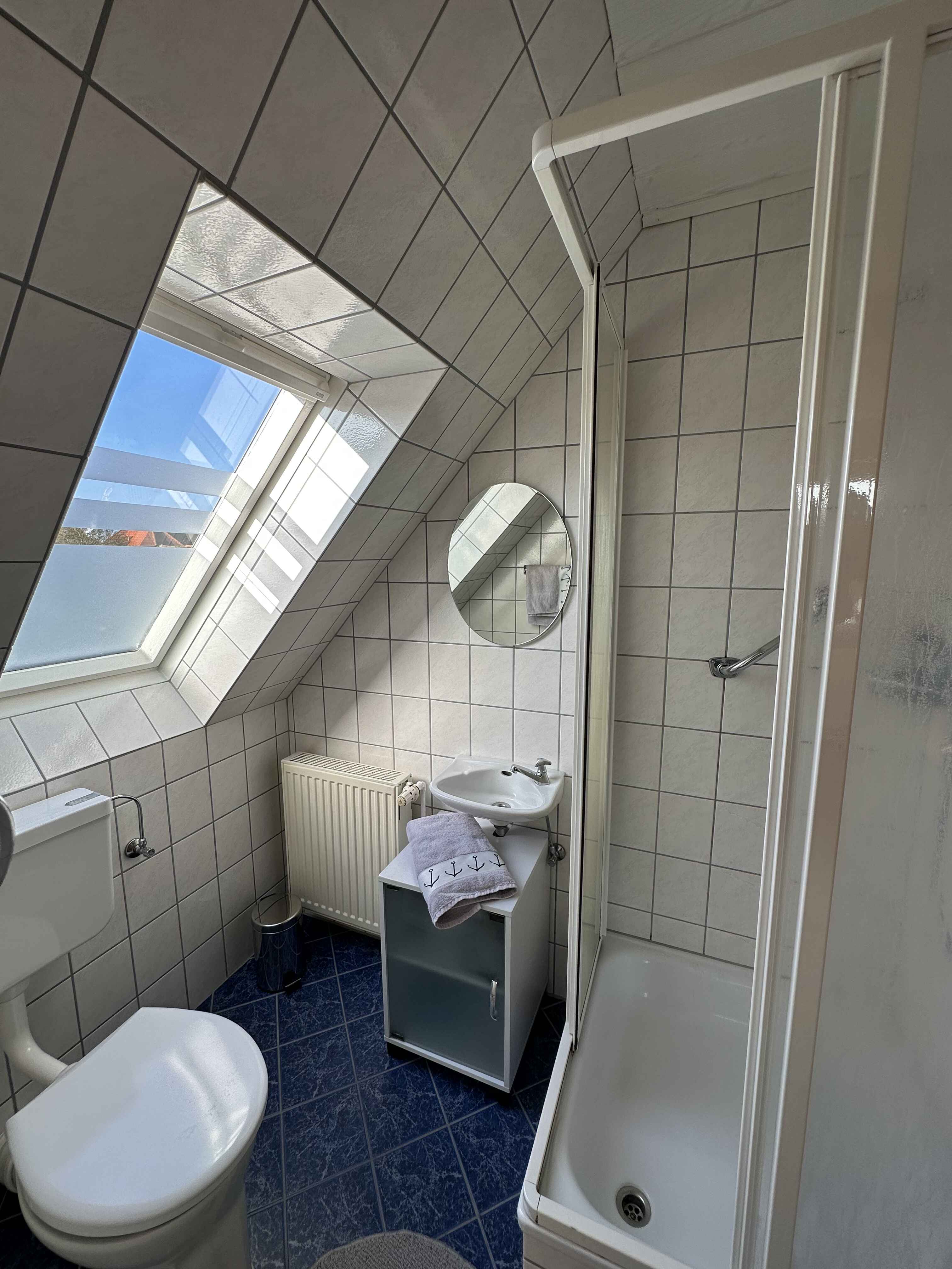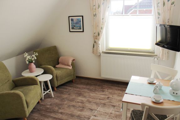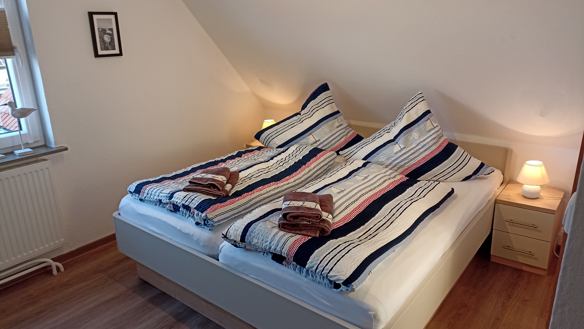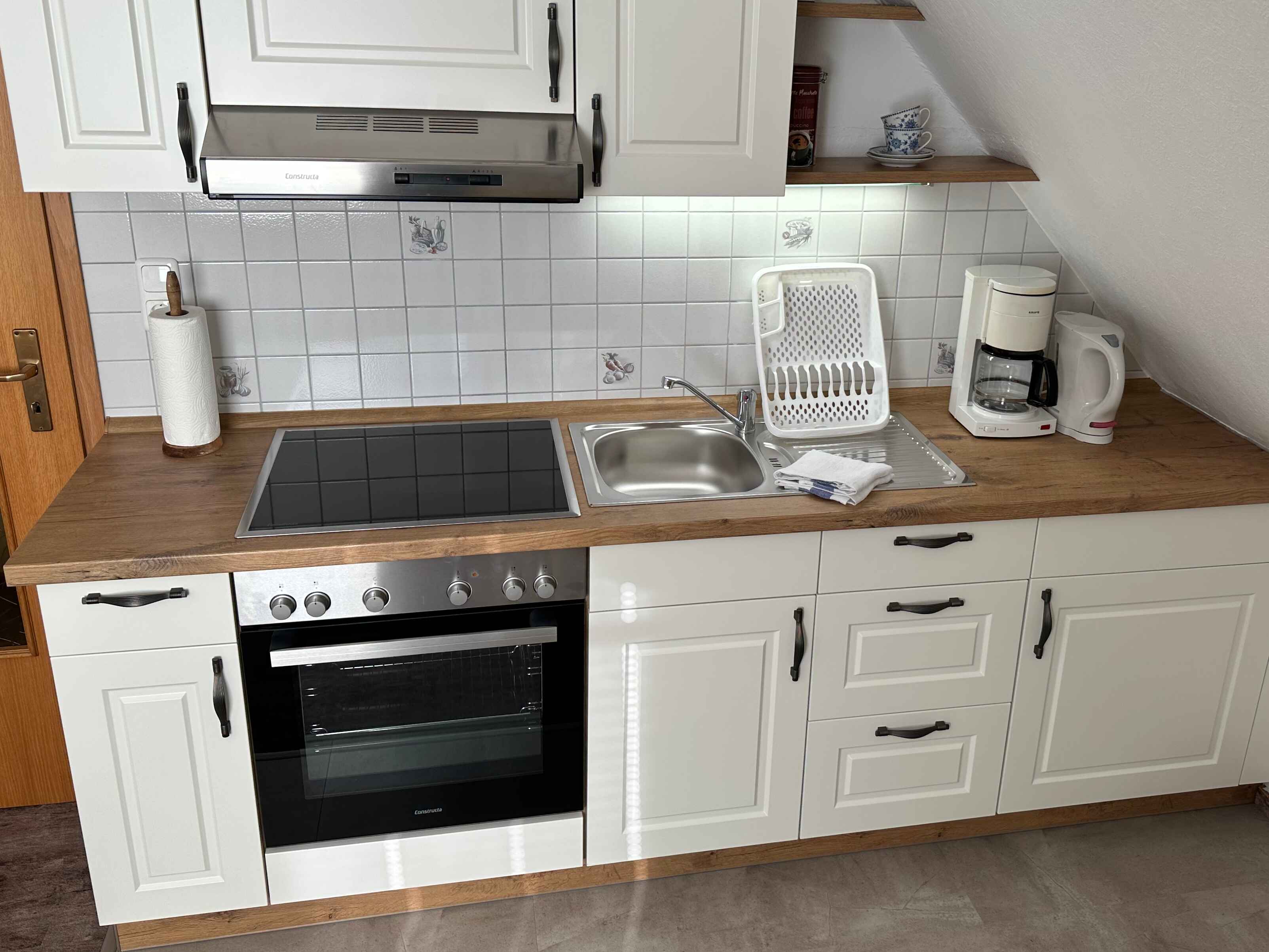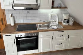 Unsere Ferienwohnung in der 1. Etage bietet Ihnen einen gemütlichen Wohn-und Essbereich, ein Schlafzimmer mit erhöhtem Doppelbett, am Fussende offen, hochwertigen neuen Matratzen, verstellbarem Lattenrost und ein Bad mit Dusche und WC. Im Garten laden ein Strandkorb und Gartenstühle zum Verweilen ein. Eine komplette neue Kücheneinrichtung( Febr. 2023) für zwei Personen steht zur Verfügung. Backofen mit Ceranfeld, Kühlschrank mit Eisfach sowie Sat-TV im Wohnbereich. Kostenloses WLAN, Parkplatz am Haus.