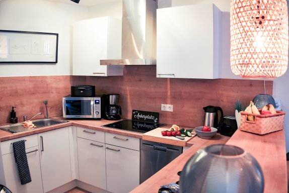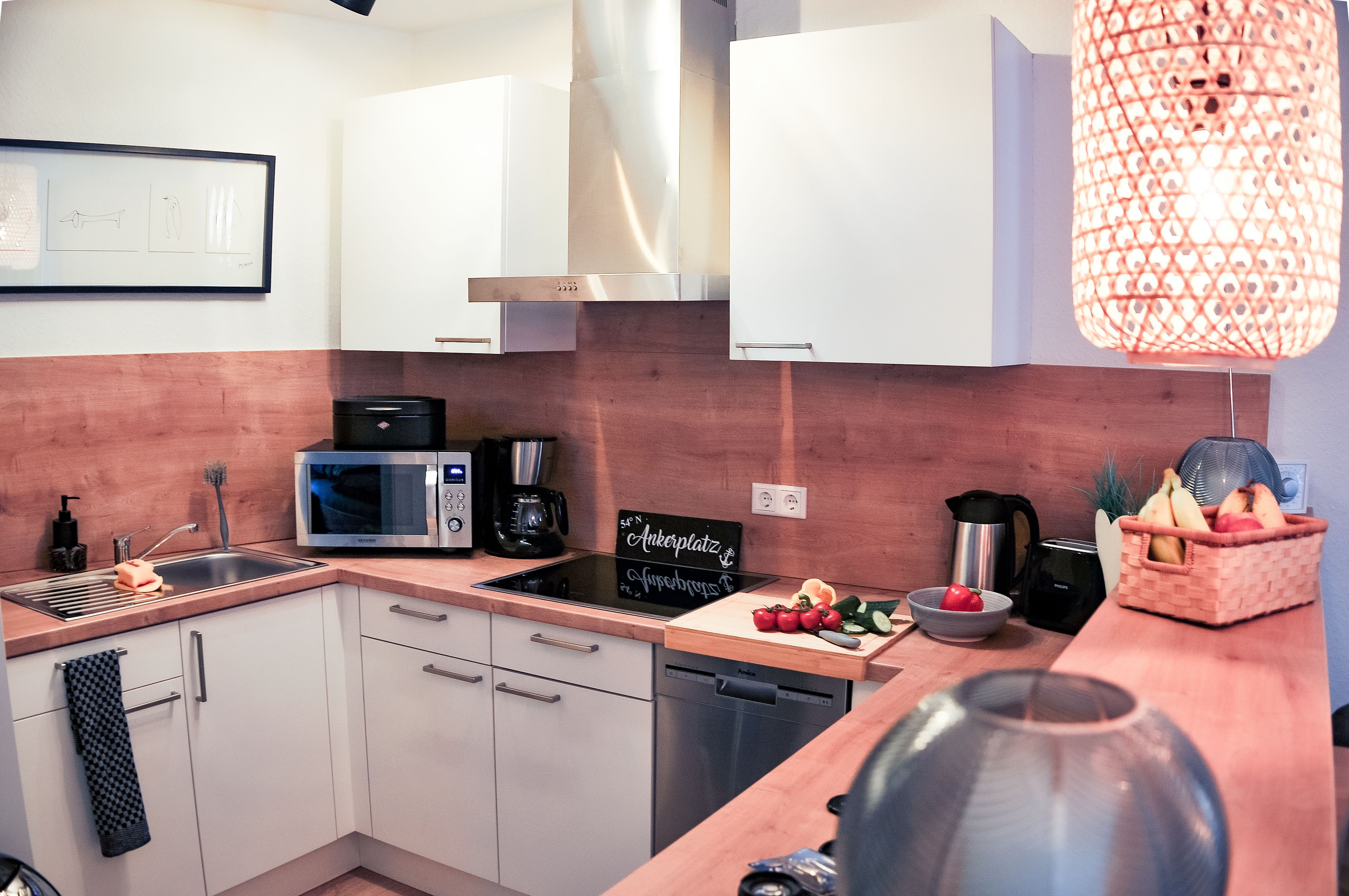 Küchenzeile: Cerankochfeld, Mikrowelle/Backofen , Geschirrspüler, Kühlschrank mit Gefrierfach, Kaffeemaschine, Wasserkocher, Toaster.