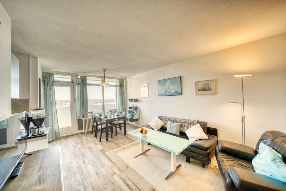 Die Wohnung liegt im Haus L Ferienpark, in der 9. Etage, mit Balkon zum Innenhof, der einen schönen Blick auf die Grünanlagen und die Ostsee Richtung Fehmarn bietet.