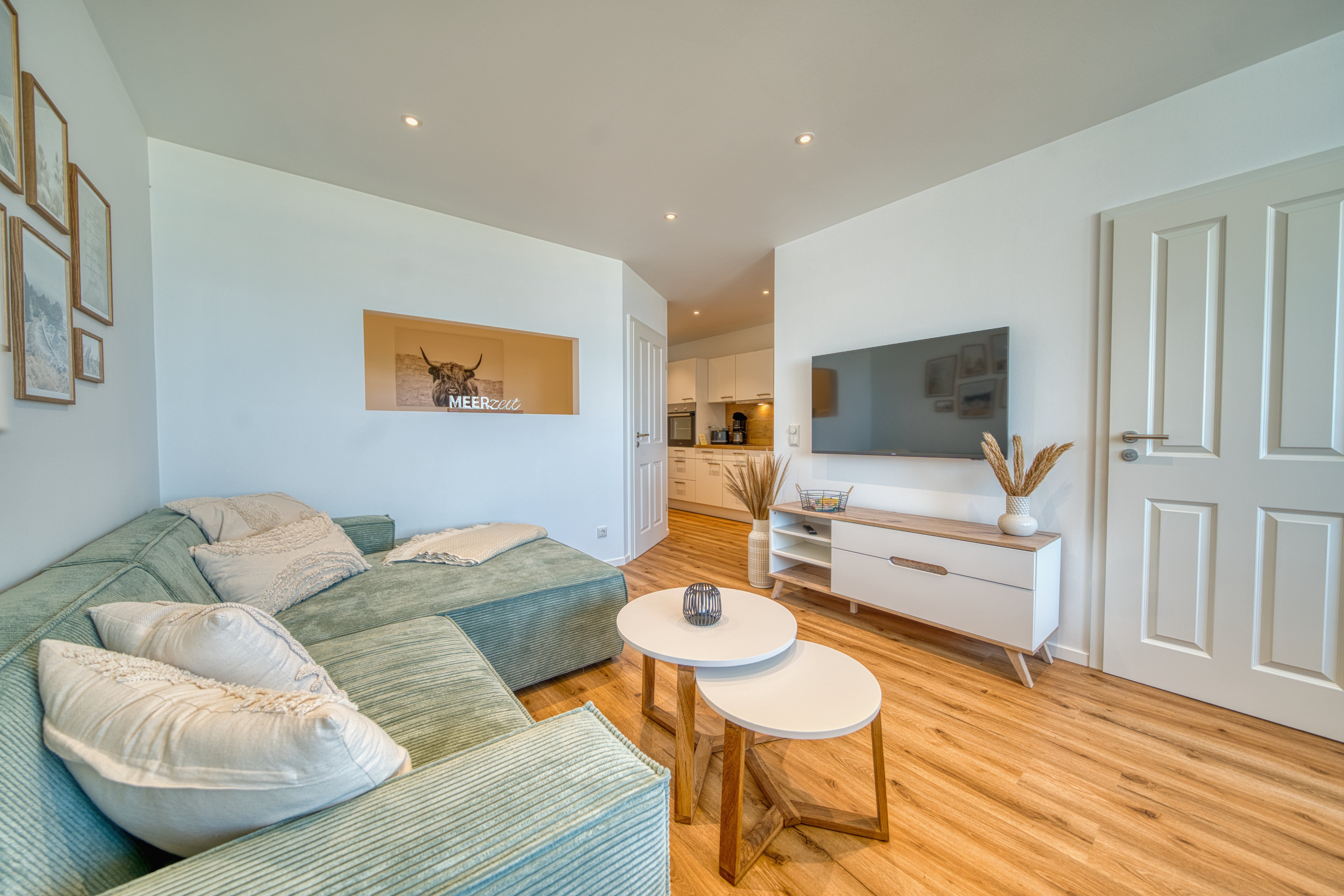 Wohnzimmer mit gemütlichem Ecksofa, Smart-TV und Esstisch direkt vor dem Balkon