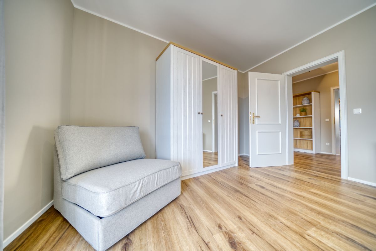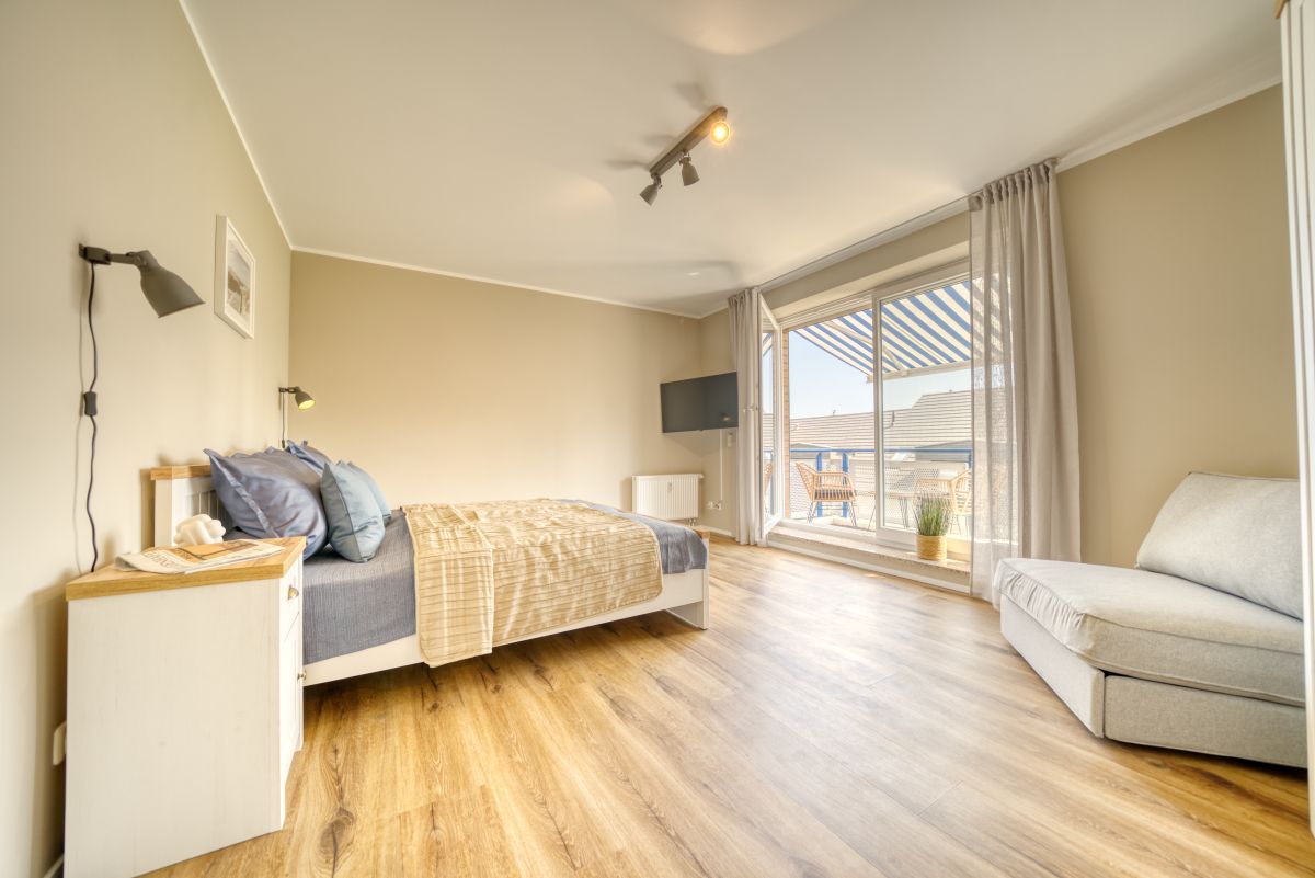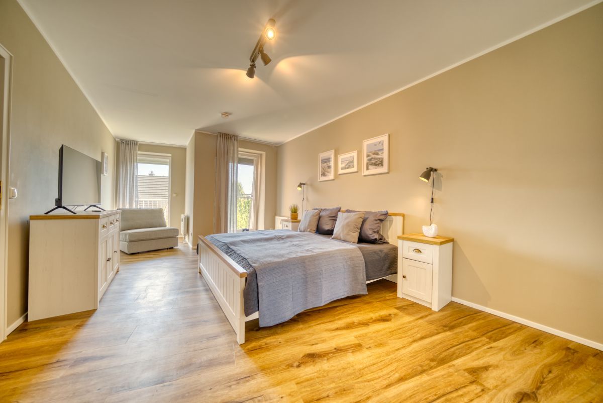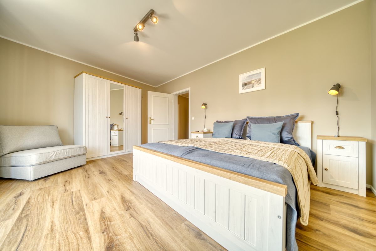 Schlafzimmer 1: Doppelbett, Smart-TV (43 Zoll), Kleiderschrank, Sessel mit Bettfunktion, Zugang zum Balkon