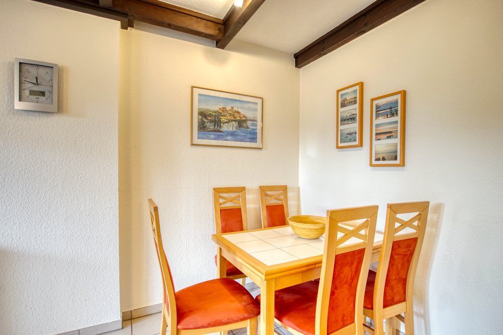 Wohnzimmer im Erdgeschoss mit Schlafcouch, Esstisch und Flachbild-TV