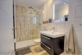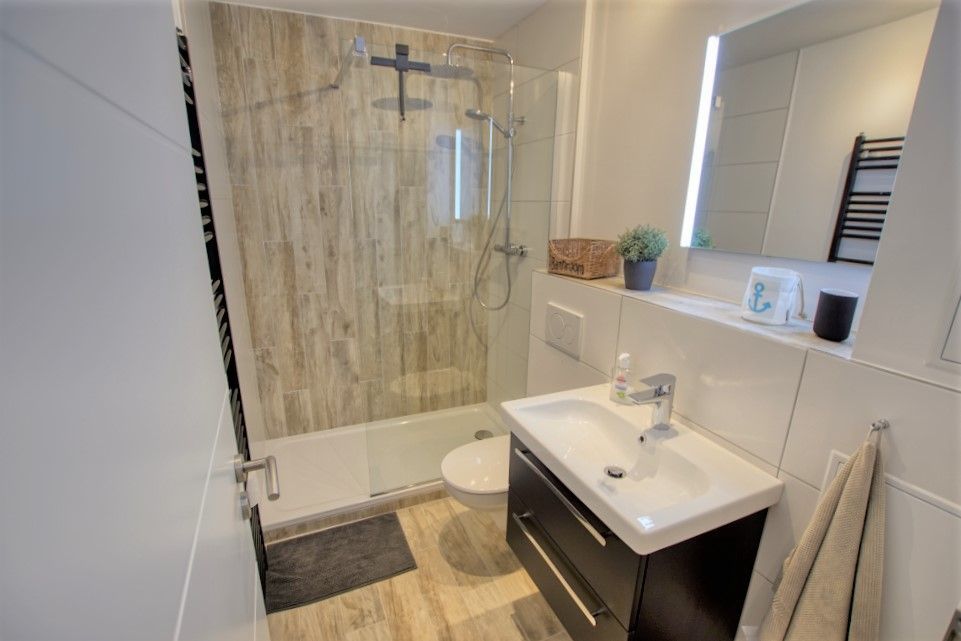 Badezimmer mit niedrigem Duscheinstieg, Fußbodenheizung und Handtuchtrockner für maximalen Komfort