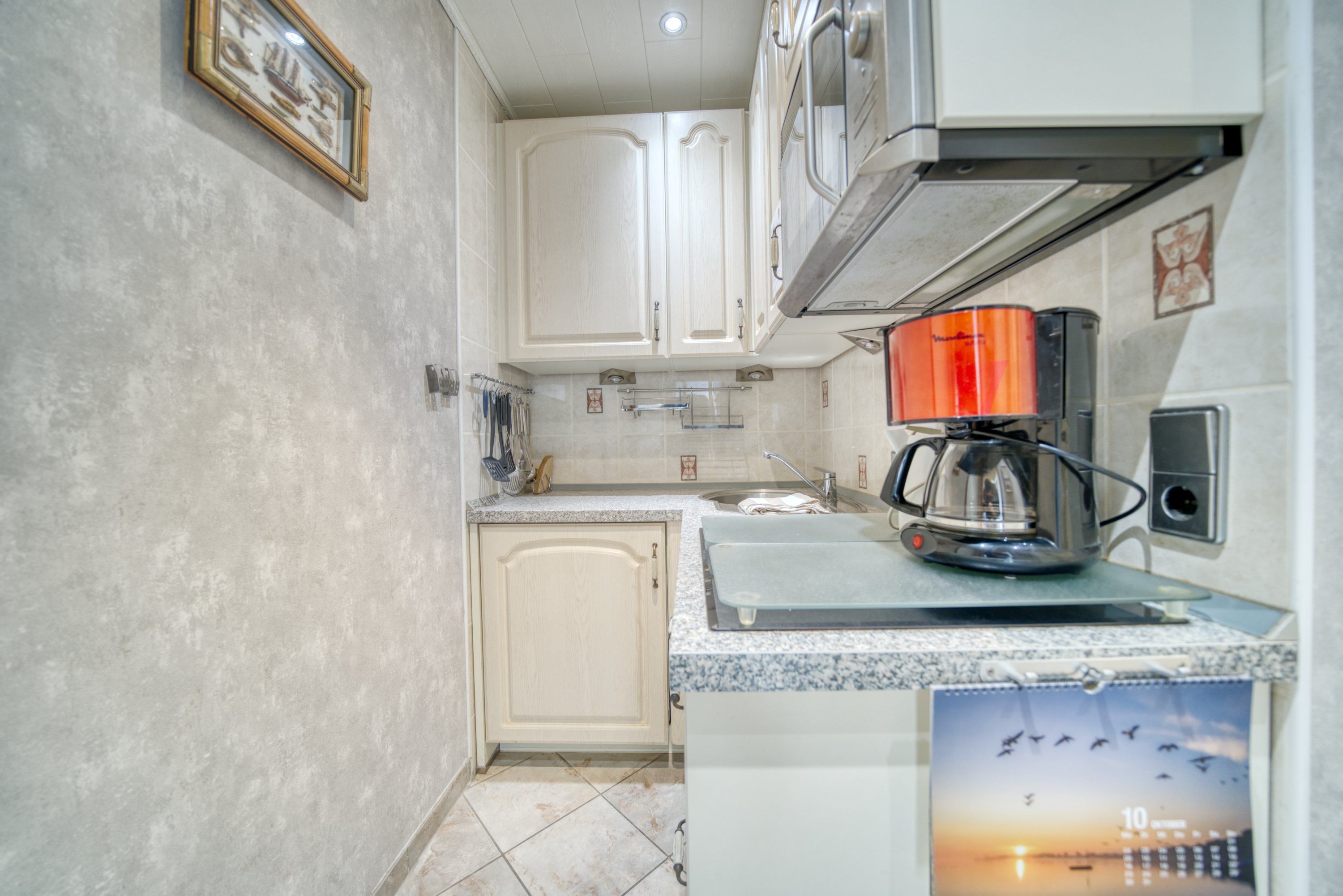 Küche mit Ceranherd, Mikrowelle, Kühlschrank mit Gefriermöglichkeit, Wasserkocher, Filterkaffeemaschine und Toaster