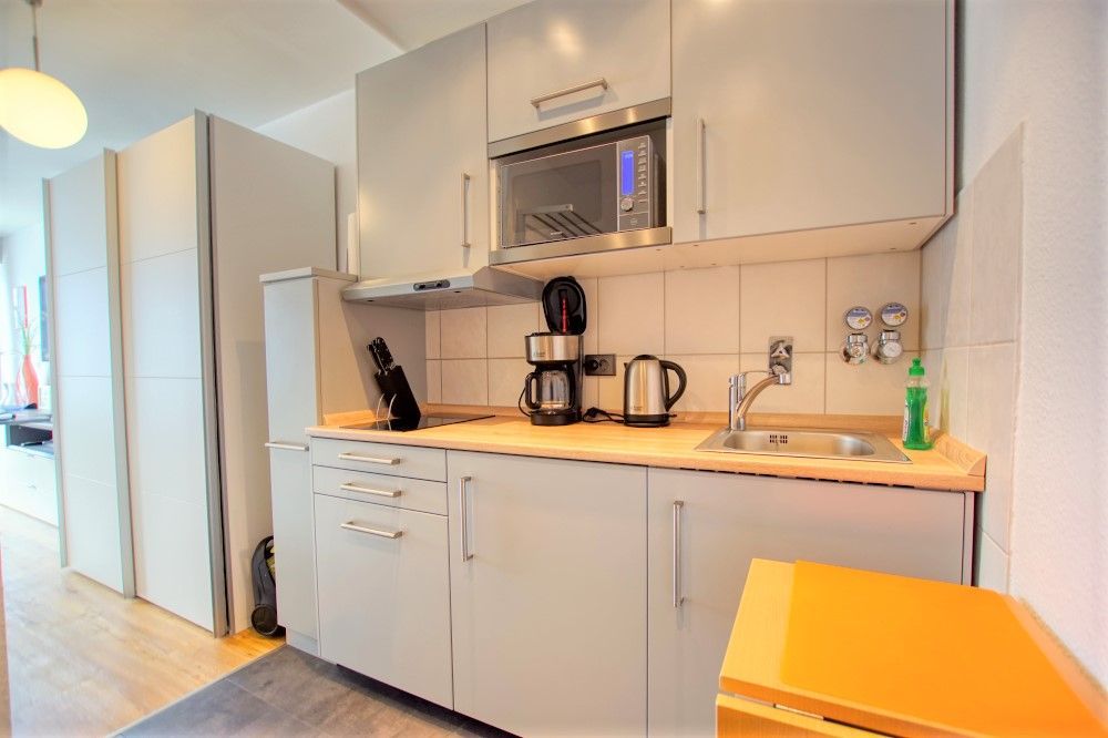 Küche: Geschirrspüler, Hochbauofen, Mikrowelle, Kühlschrank mit Gefrierfach, Wasserkocher, 2-Plattenherd, Toaster, Filterkaffeemaschine