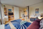 Der Wohn- und Schlafbereich ist mit einem Doppelbett ausgestattet. Dank des Holz- oder Parkettbodens sorgt die Wohnung für ein angenehmes Wohngefühl.