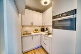 Moderne Küche mit kompletter Ausstattung: Kühlschrank, 2-Platten-Ceranfeld, Mikrowelle mit Grill-/Backfunktion, Heißluftfritteuse, Kaffeemaschine und Toaster