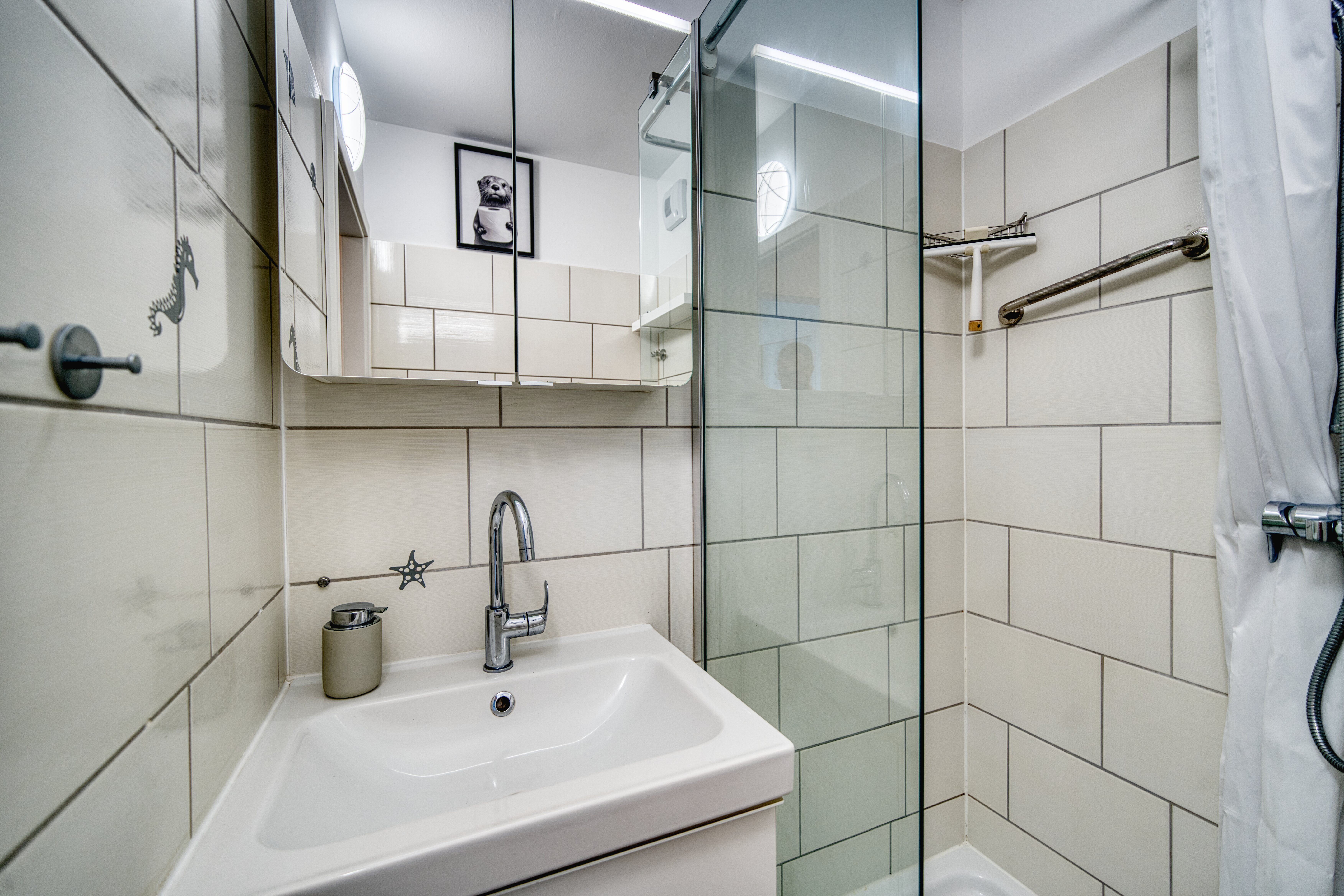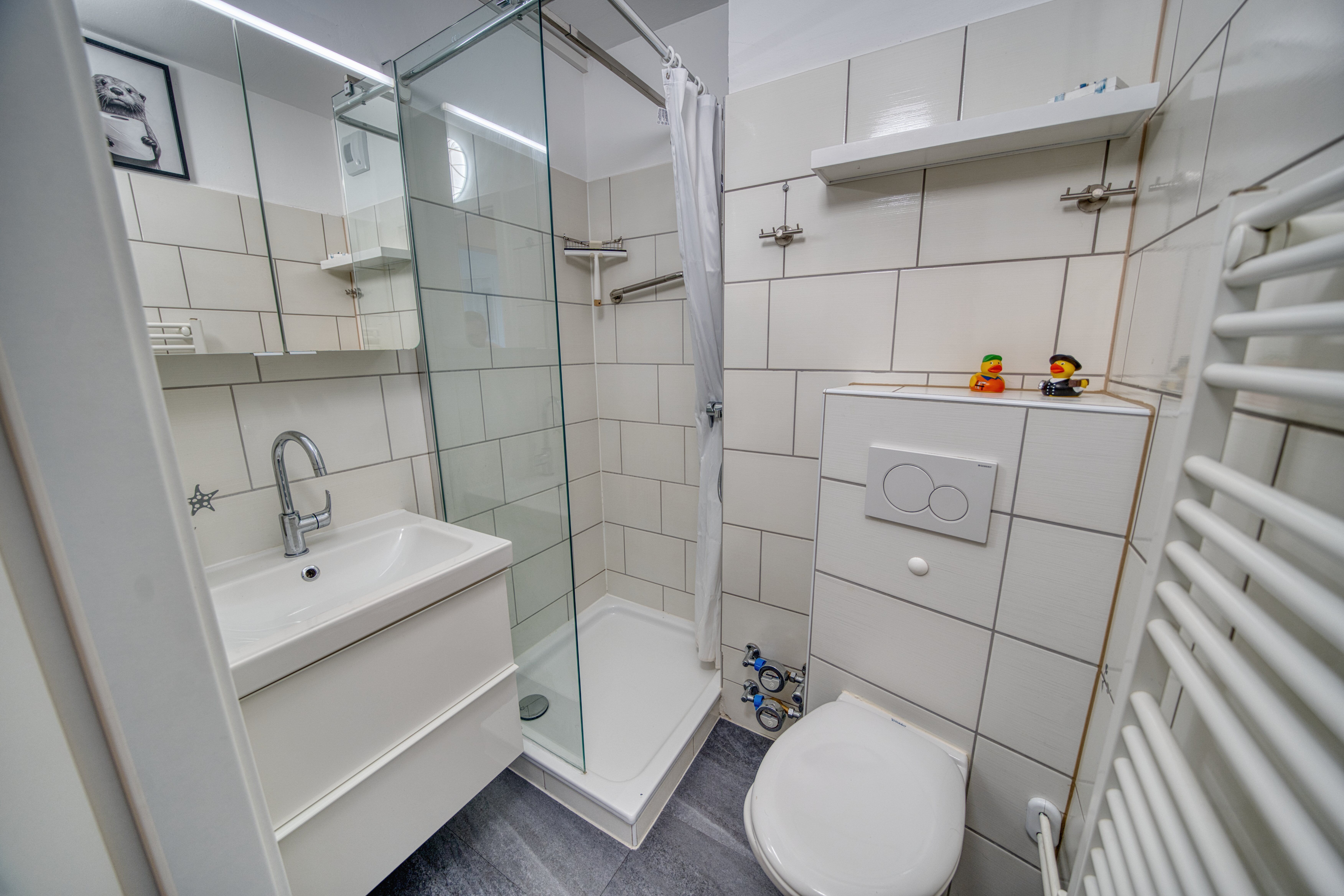 Neues Bad mit Dusche (Glasfront & Duschvorhang) und WC