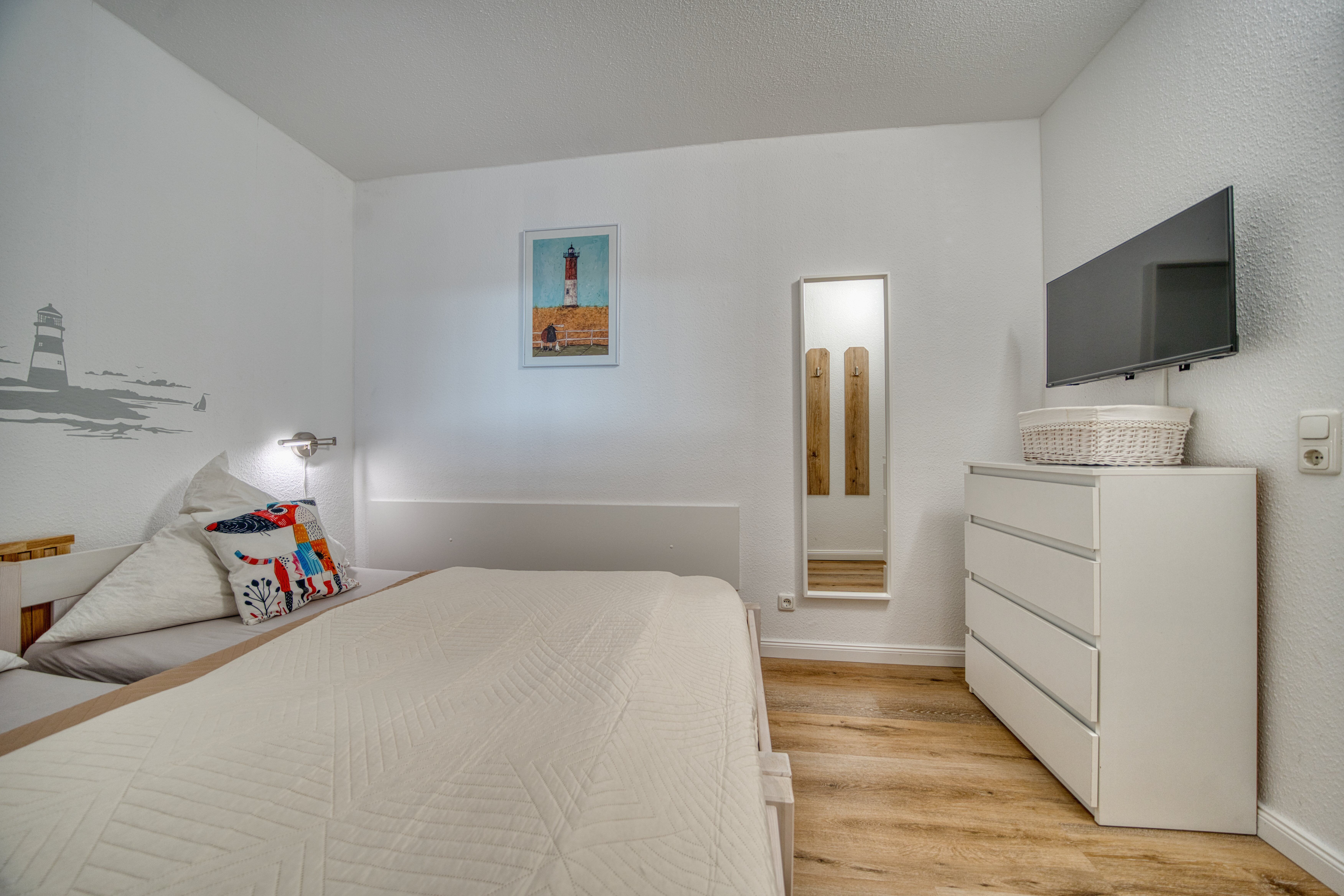 Separates Elternschlafzimmer mit Doppelbett (zwei Einzelbetten auseinander- und zusammenschiebbar) und zusätzlichem Fernseher