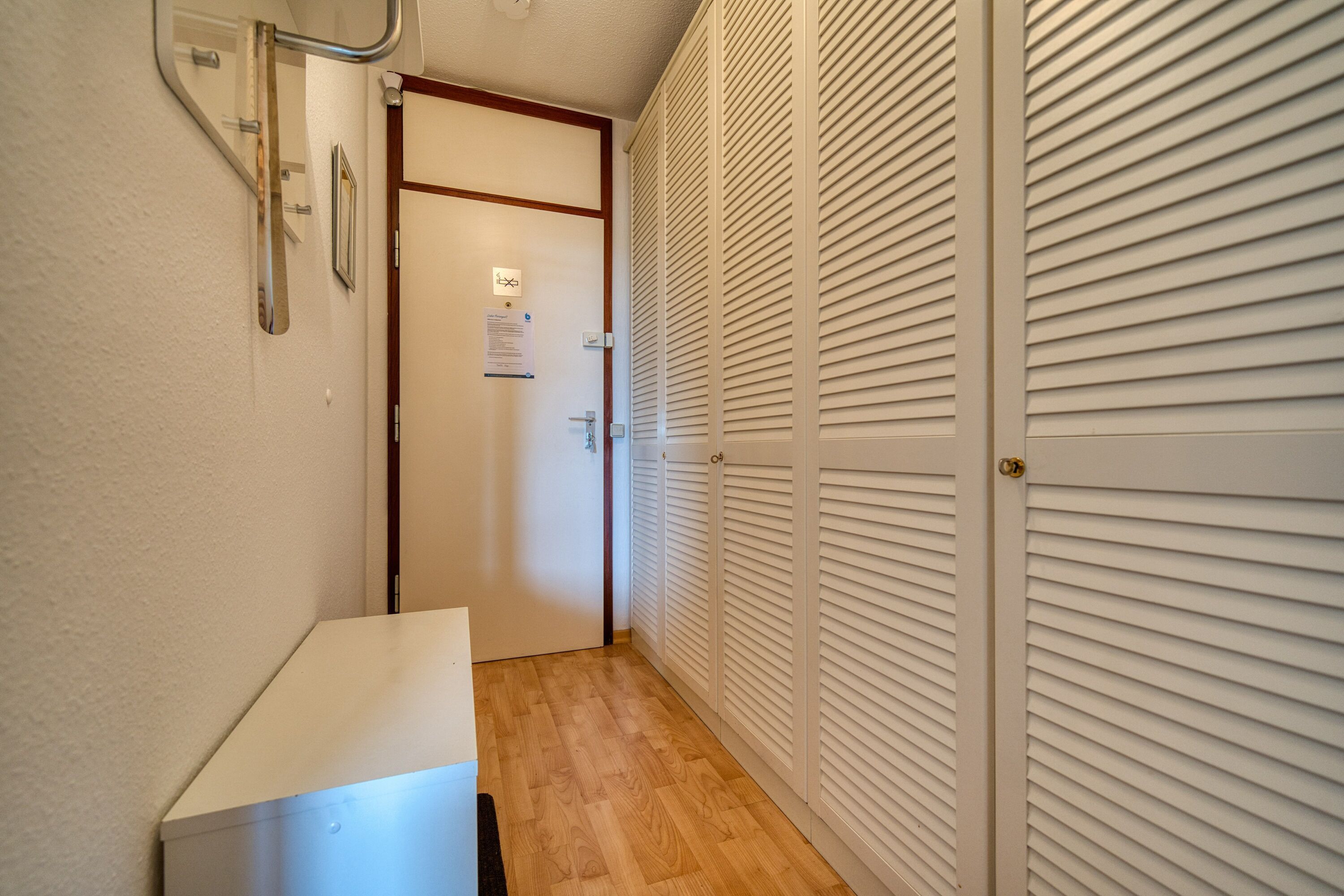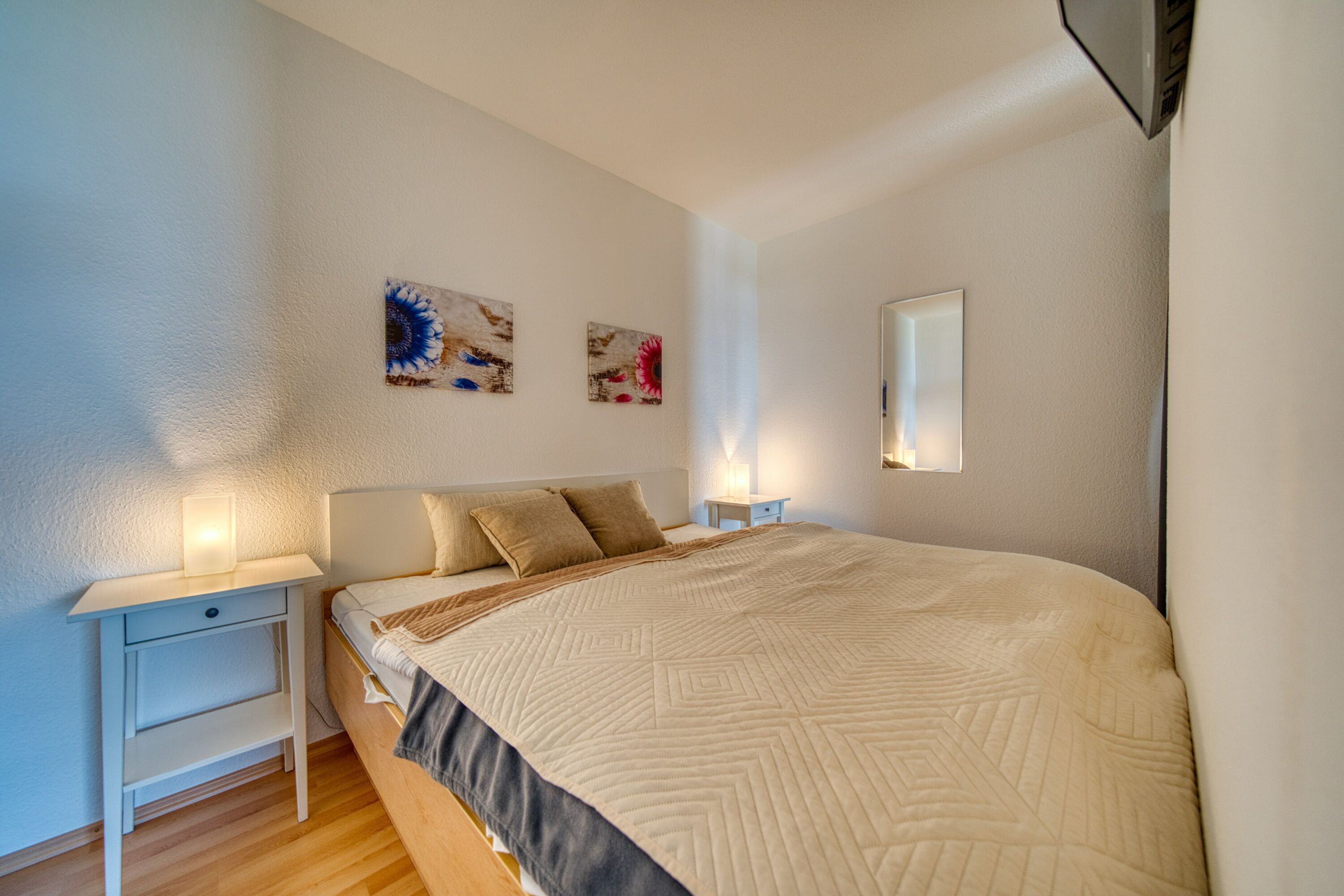 Schlafbereich mit Doppelbett (2x 90x200?cm), durch eine Halbwand vom Wohnbereich abgetrennt, mit eigenem TV