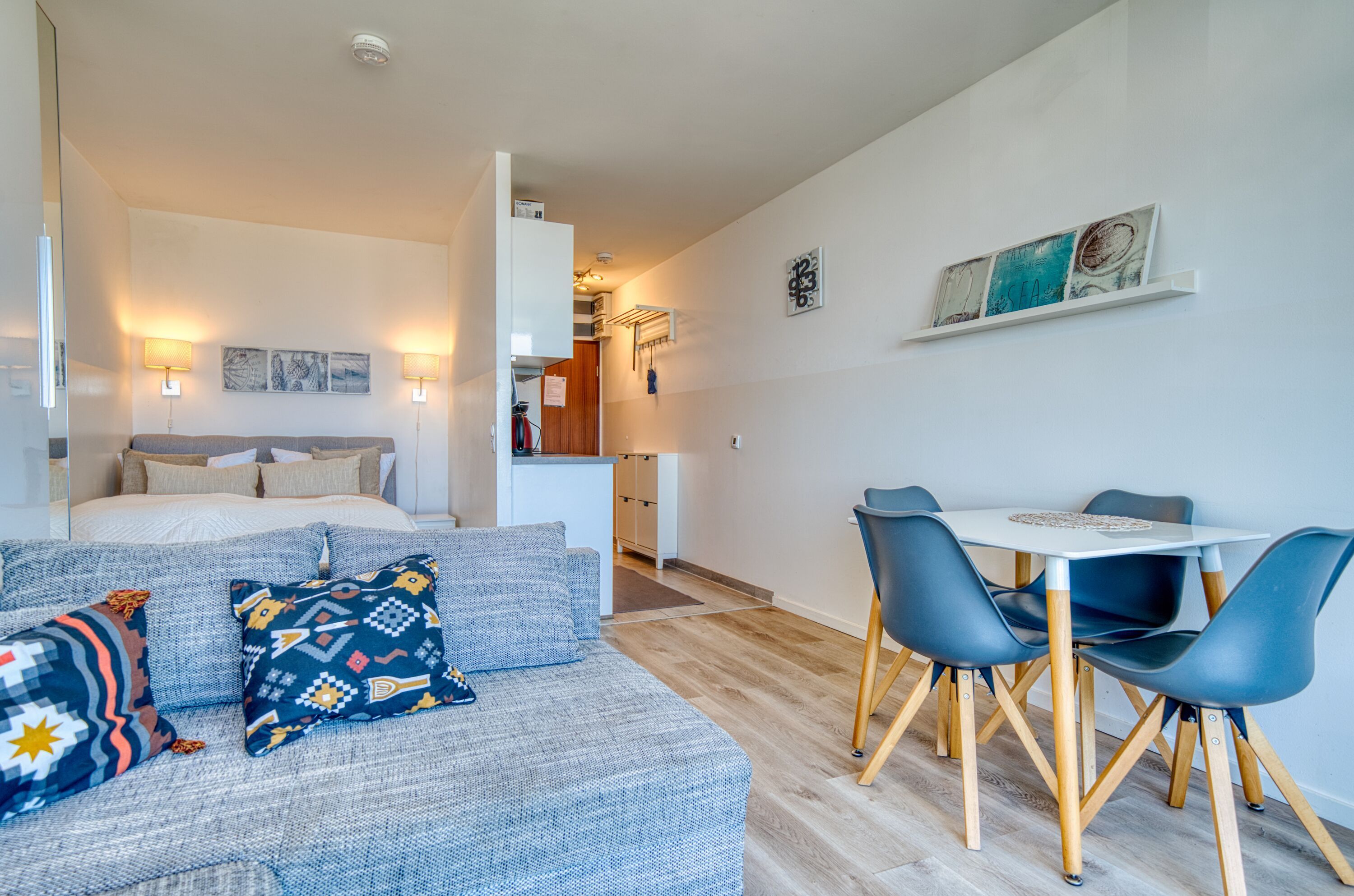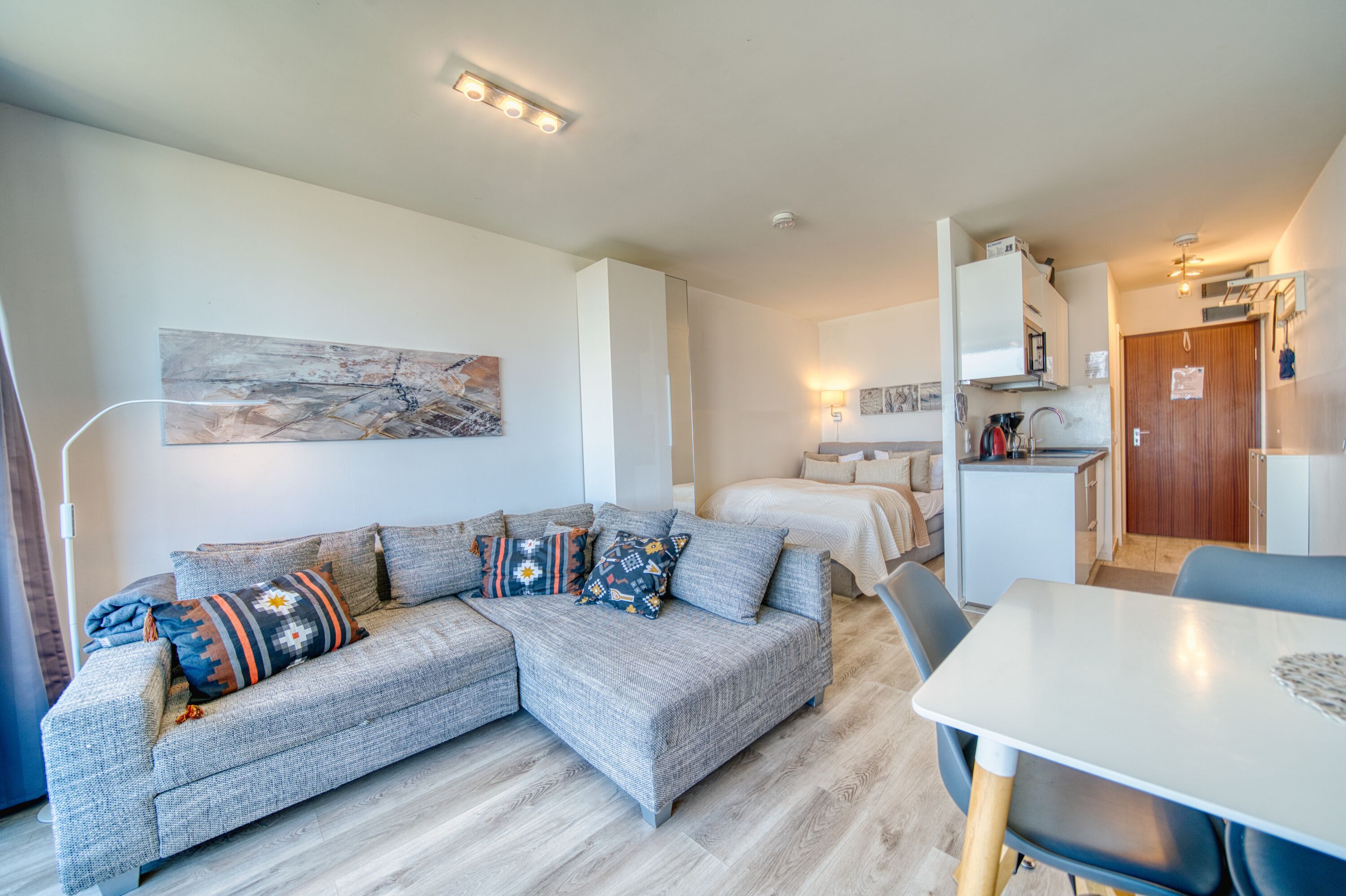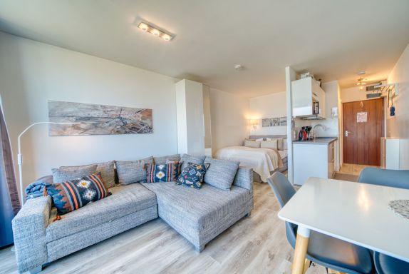 Schlafbereich: Der Wohn-Schlafraum ist mit einem Doppelbett und einer Schlafcouch ausgestattet, die insgesamt Platz für bis zu 4 Personen bieten.