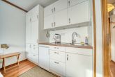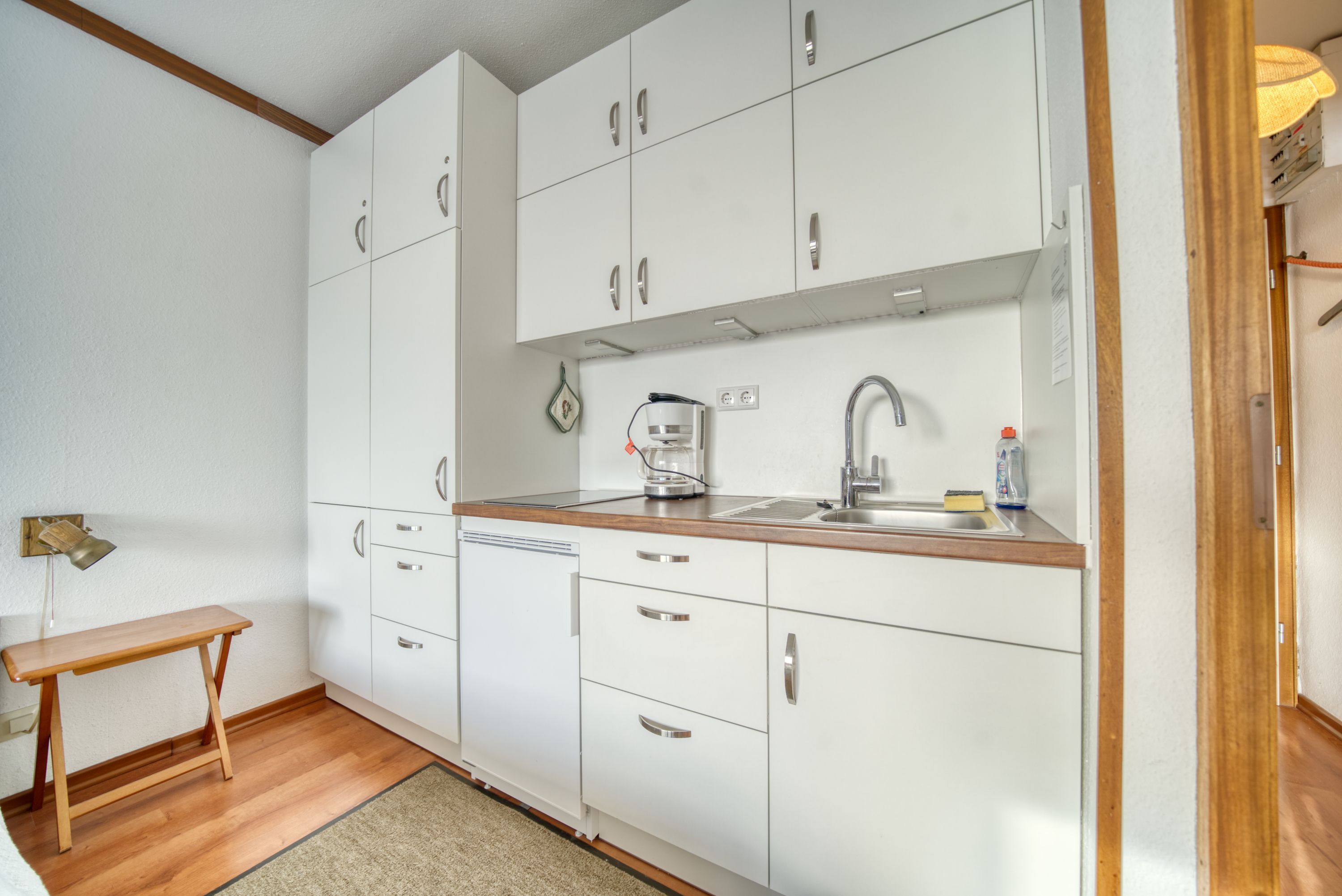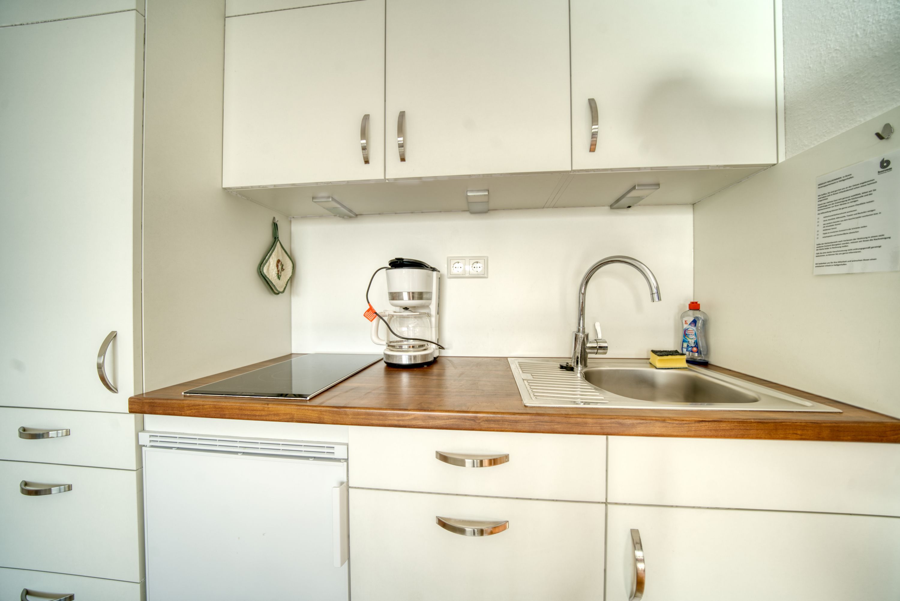Küche mit Cerankochfeld, Wasserkocher, Filterkaffeemaschine, Toaster & Kühlschrank