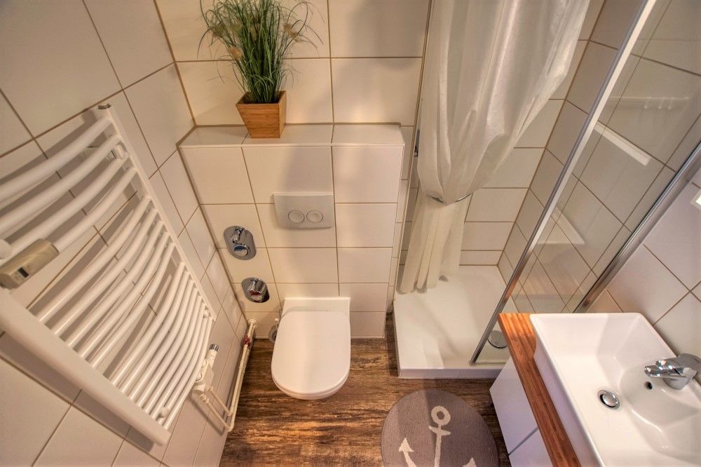 Modernes Badezimmer mit Dusche, Waschbecken und neuwertiger Ausstattung