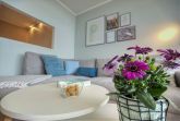 Für Naturliebhabende sind Naturstrand und eine Steilküste ortsnah zu erkunden; ebenso ist auch der Badestrand nur wenige Gehminuten entfernt (ca. 300 m). Genießen Sie den Sonnenuntergang entweder vom eigenen Balkon, am Strand oder in der Strandbar nebenan. Mit Restaurants, Cafés, Bäckereien in direkter Umgebung im Ferienpark sowie an der Erlebnis-Seebrücke (2 km) und am Hafen sind Sie kulinarisch bestens versorgt.
