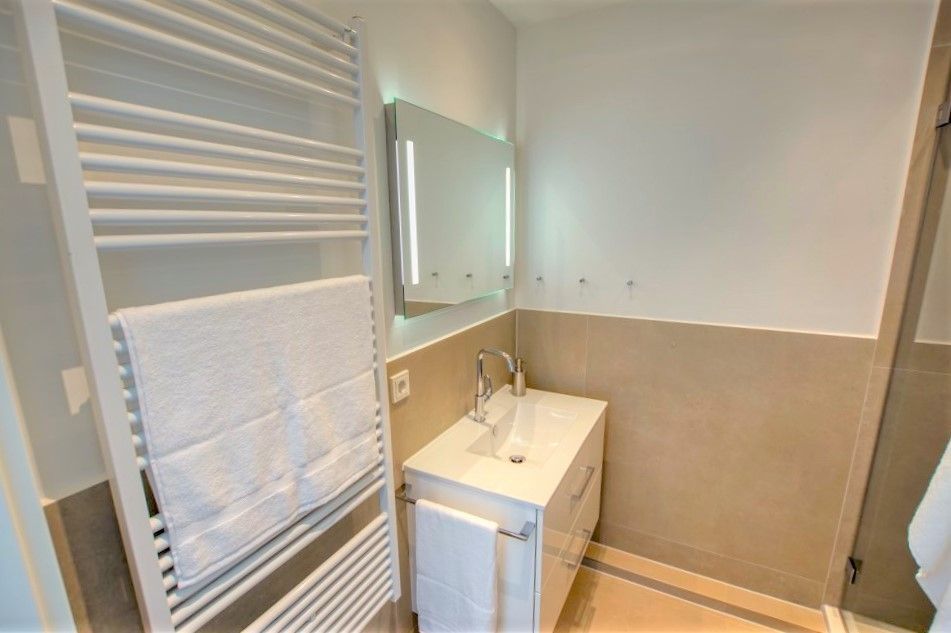 Modernes Bad mit ebenerdiger Regendusche und Waschtisch mit Stauraum und Föhn