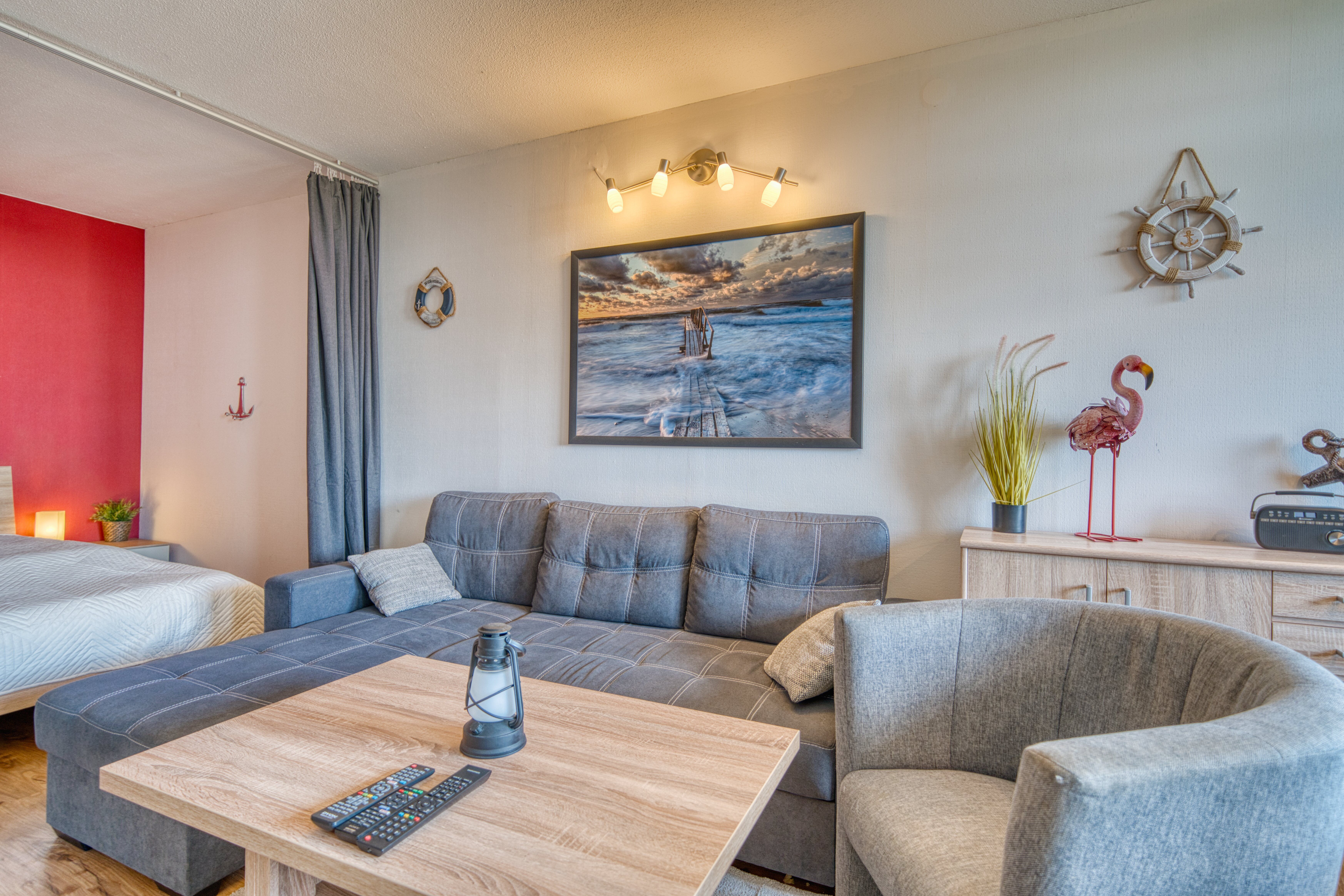 Wohn-Schlafbereich mit Doppelbett und Schlafsofa