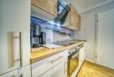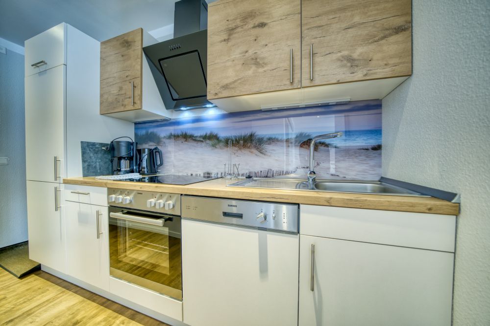hochwertige Einbauküche mit 4-Platten-Ceranfeld, Geschirrspüler, Backofen, Kühlschrank mit Gefrierfach, Kaffeemaschine, Wasserkocher und vollständiger Küchenausstattung