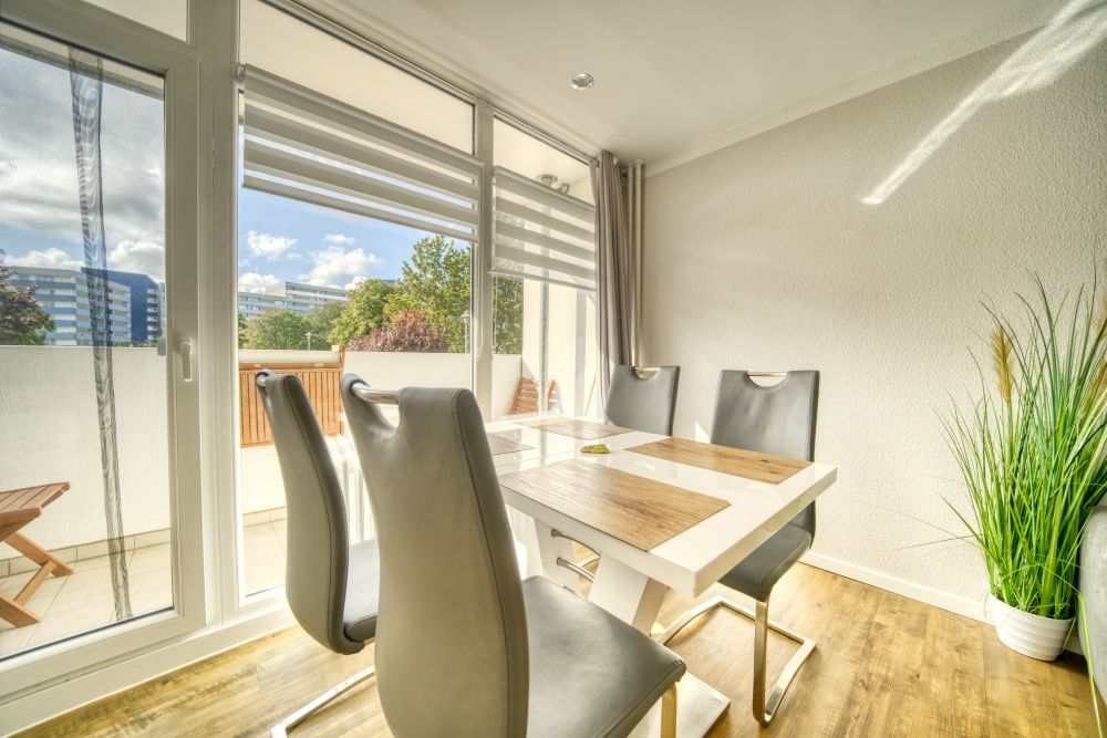 helles Wohn- und Esszimmer mit Sofa, Essecke für 4 Personen und Flachbildfernseher