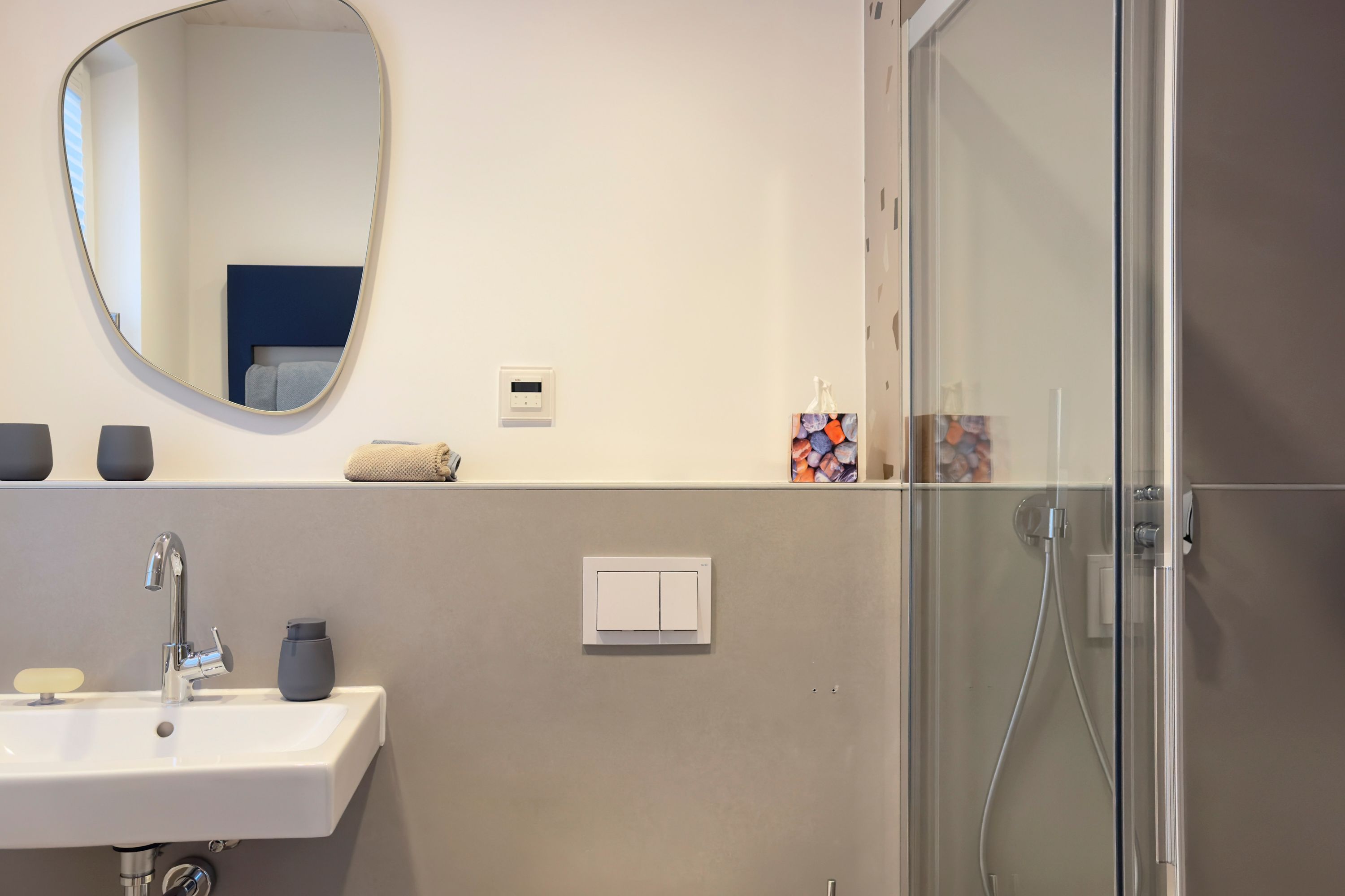 • Beide mit ebenerdiger Regendusche, WC, Fußbodenheizung und Tageslicht.