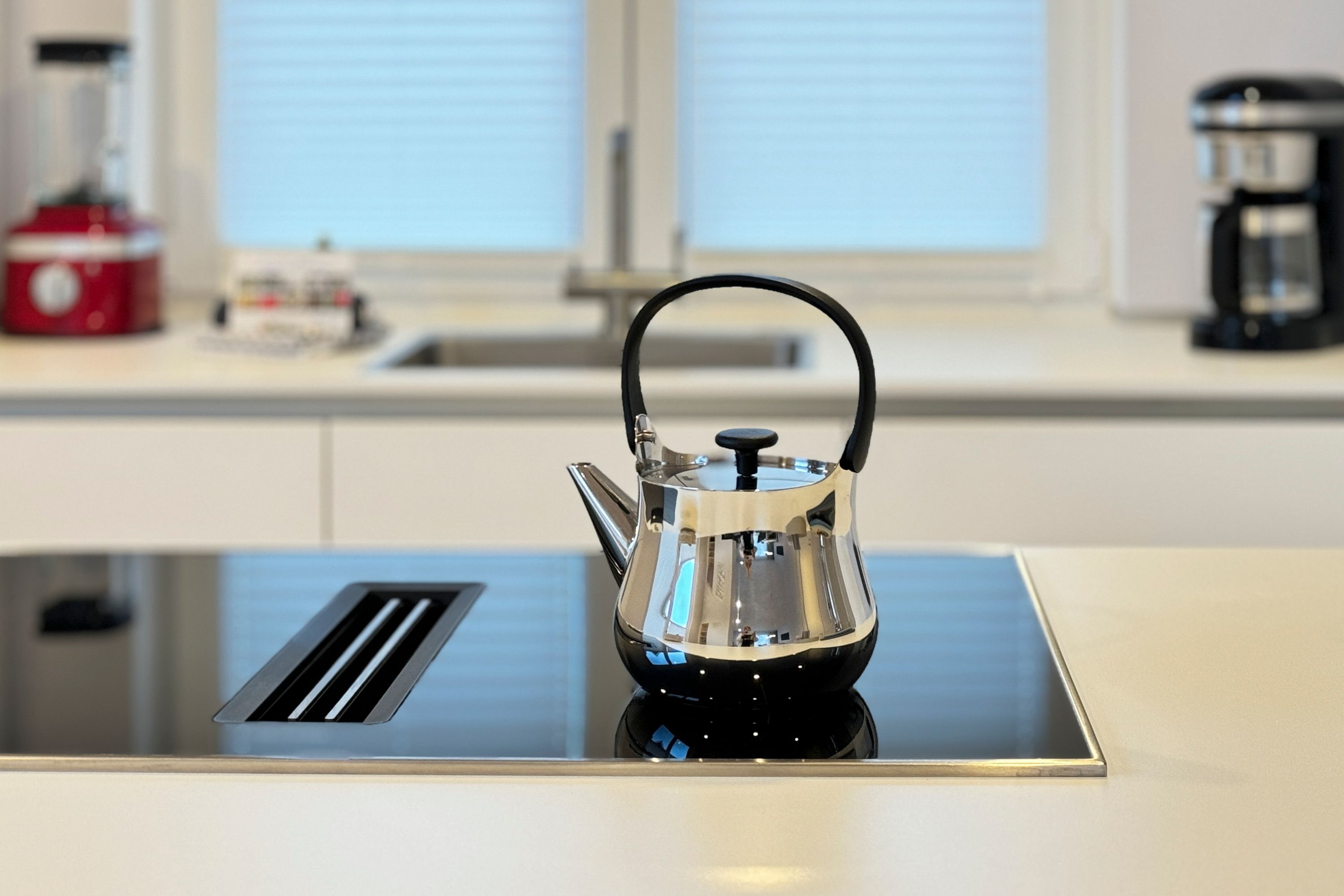 • Voll ausgestattete Küche mit Geschirrspüler, Backofen, Kochfeld, Kühlschrank, Gefriermöglichkeit, Filterkaffeemaschine, Toaster und Küchenmixer.