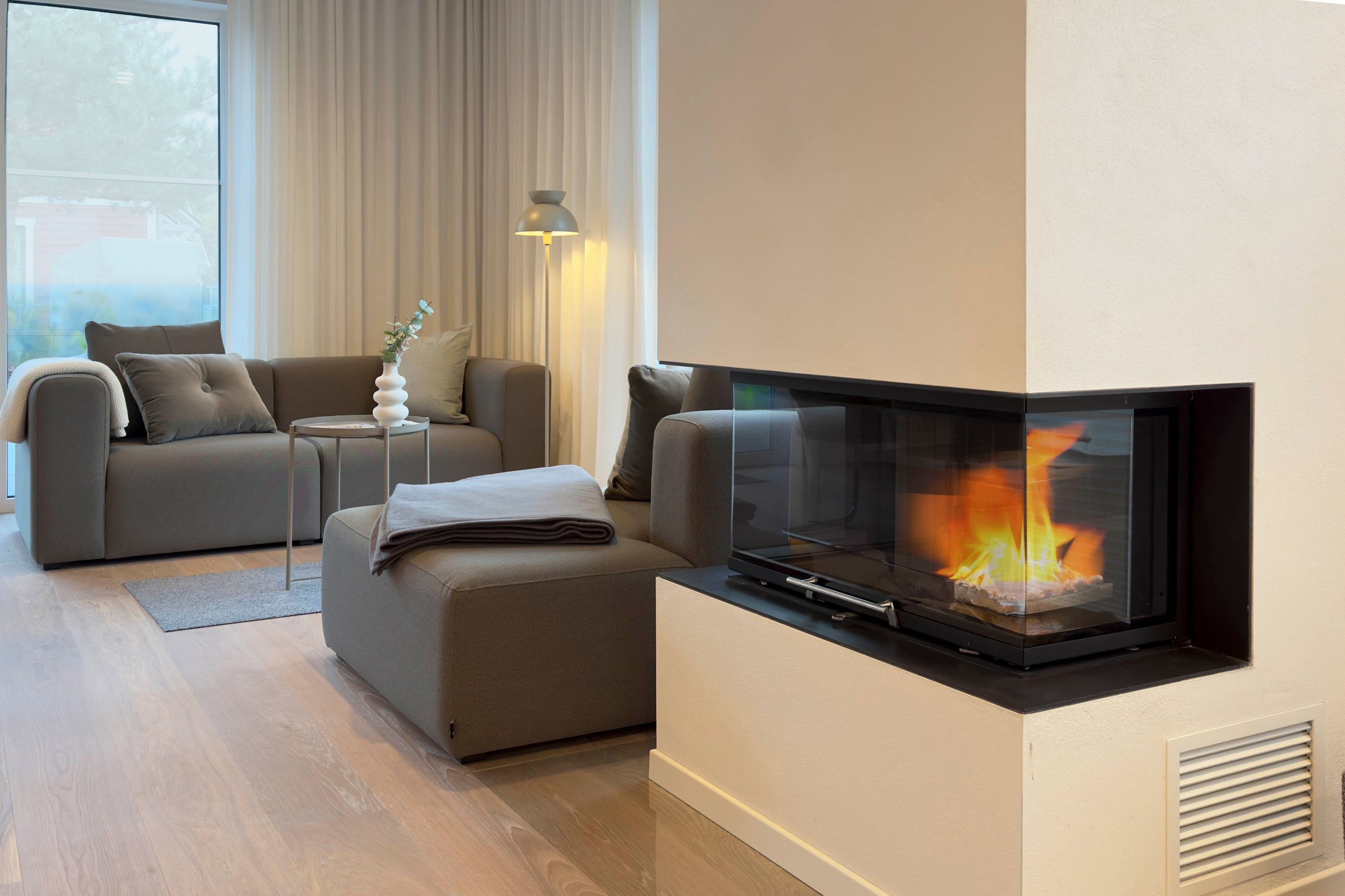 • Gemütlicher Wohnbereich mit Kamin, bequemer Sitzgruppe, Smart-TV und bodentiefen Fenstern mit Gartenblick.