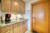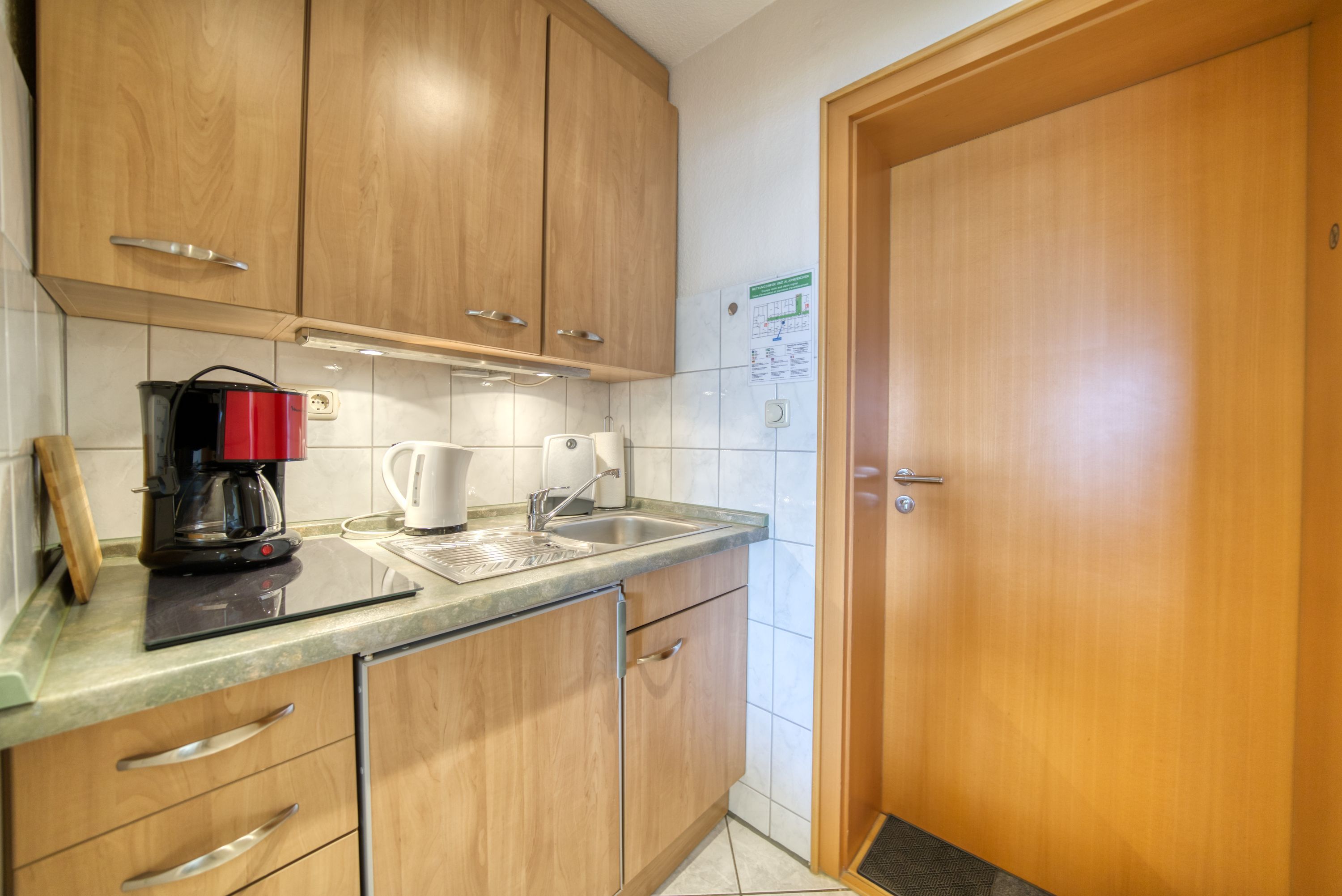 Pantryküche im Eingangsbereich mit Ceranherd, Filterkaffeemaschine, Kühlschrank, Mikrowelle, Wasserkocher und Toaster