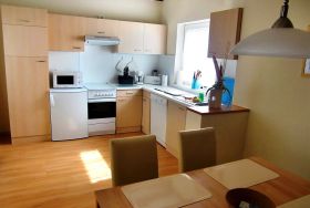 Eine komplett eingerichtete Küche und ein Bad mit Dusche sind ebenfalls vorhanden.
