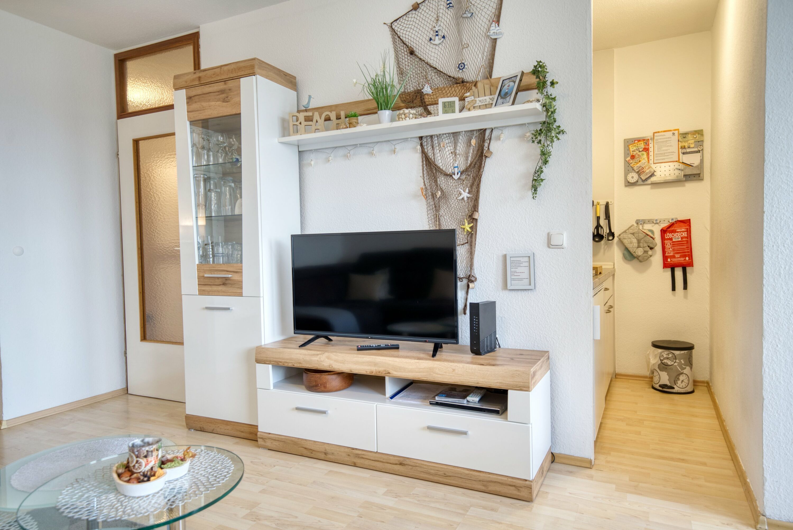 Die Wohnung verfügt über eine Wohnfläche von 45 qm mit folgender Aufteilung: Wohn-Esszimmer, Elternschlafraum mit Doppelbett (abgetrennt mit einem Vorhang), sep. Kinderzimmer mit Etagenbett, komplett eingerichtete Küche mit Mikrowelle, Kühlschrank, 4-Plattenherd, Bad mit WC und Duschkabine, Fernseher im Wohnzimmer.