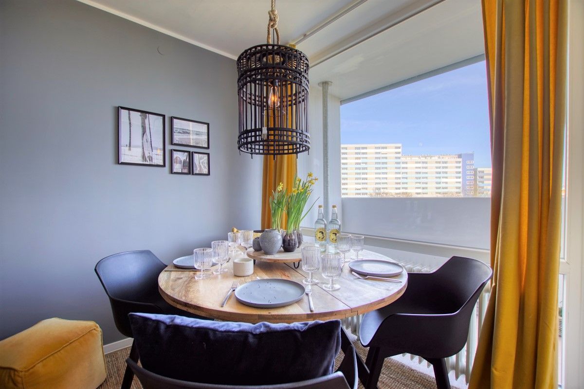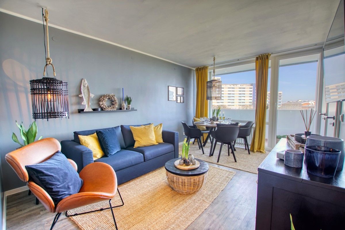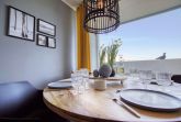 Wohn-Essbereich mit Schlafsofa, Smart TV, Sessel und Esstisch direkt am Balkonfenster