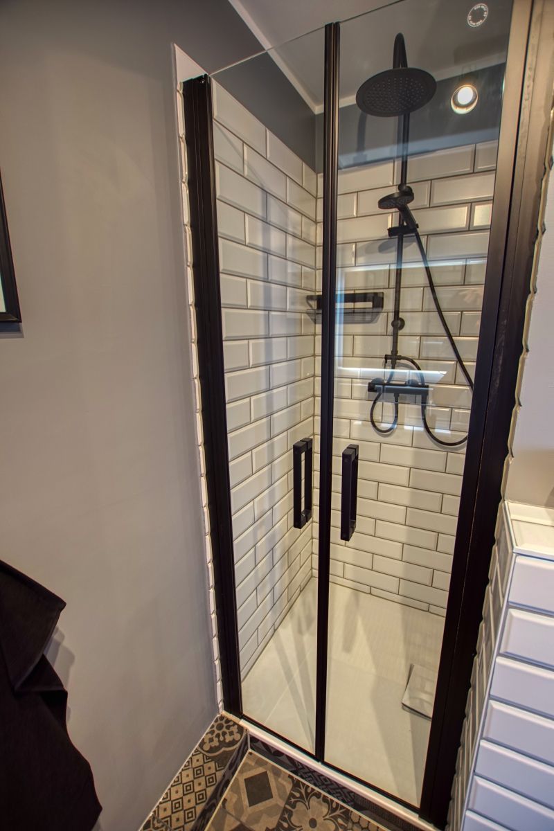 Modernes Bad mit ebenerdiger Duschkabine, WC und Handtuchtrockner