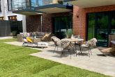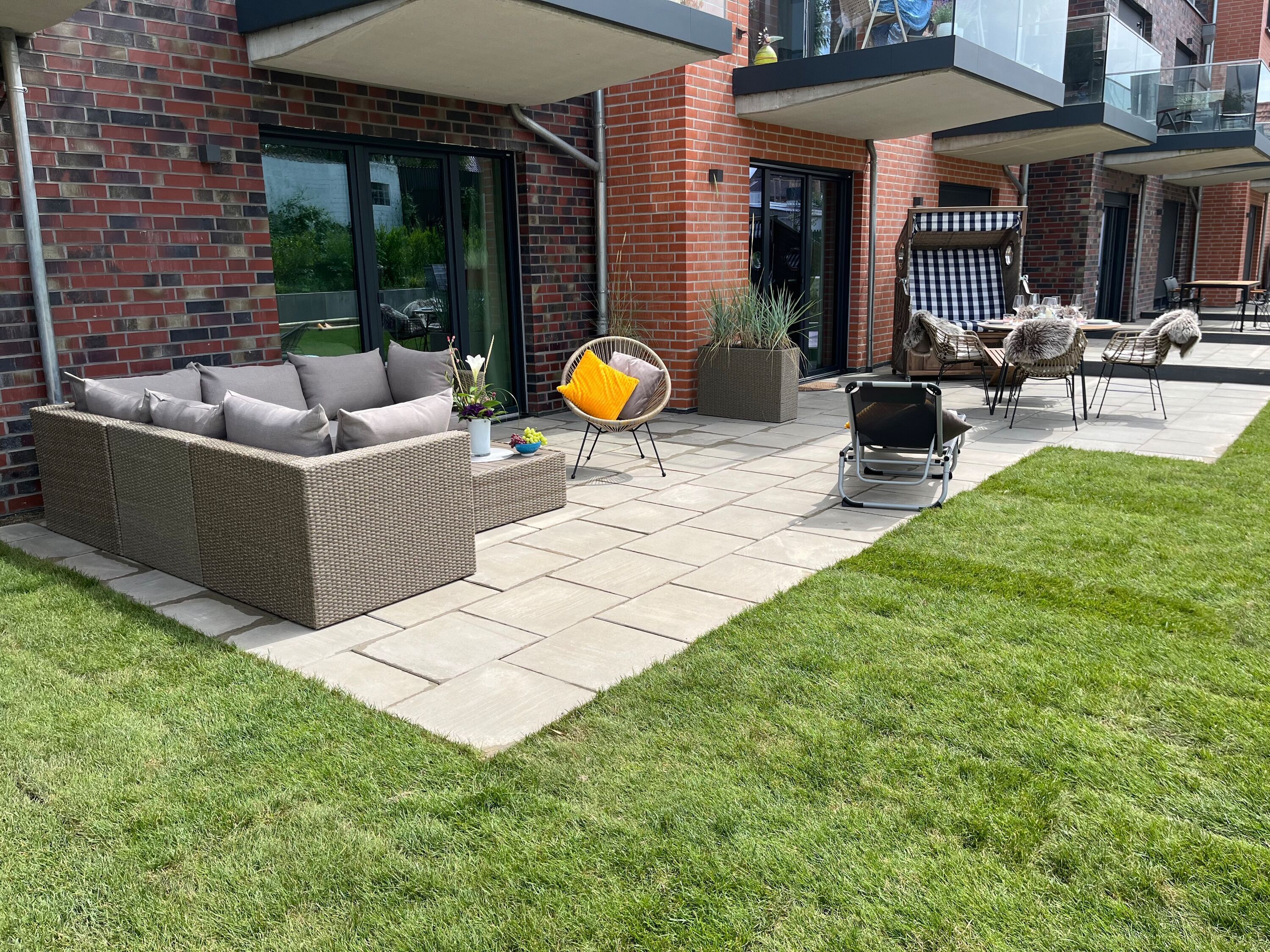 Zu den weiteren Ausstattungsmerkmalen gehören eine möblierte Terrasse und ein gemeinschaftlich nutzbarer, offener Gartenbereich.