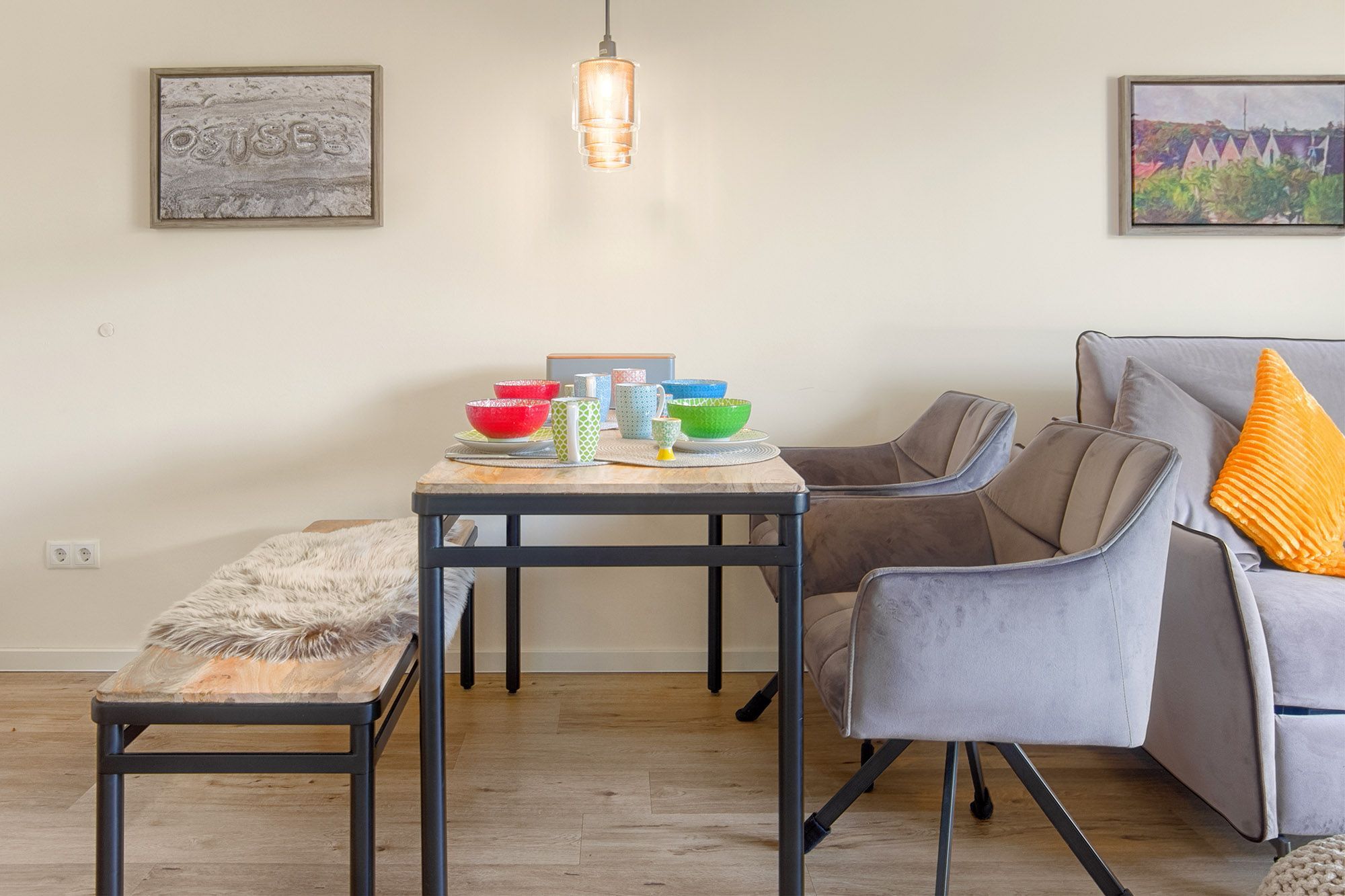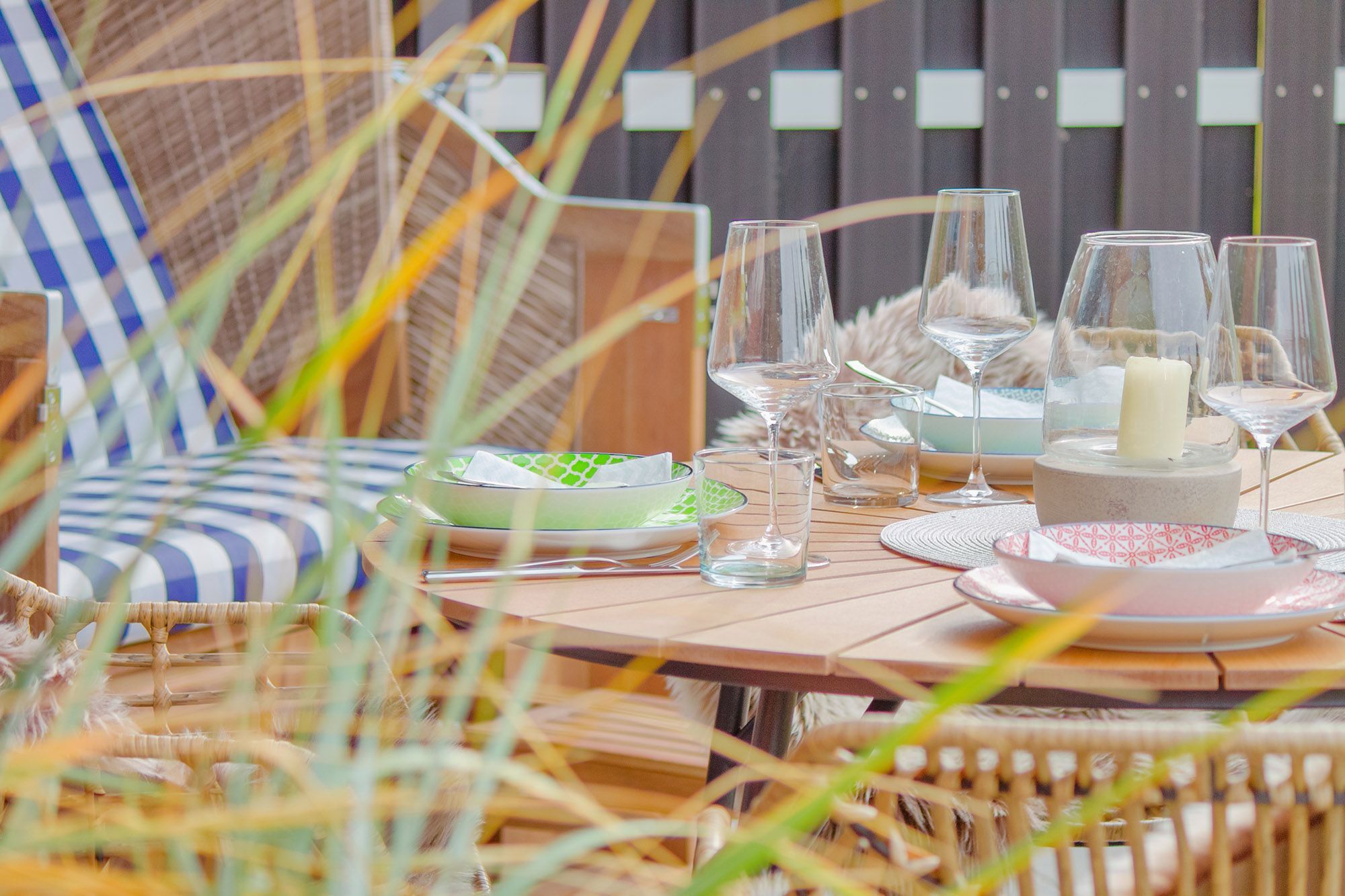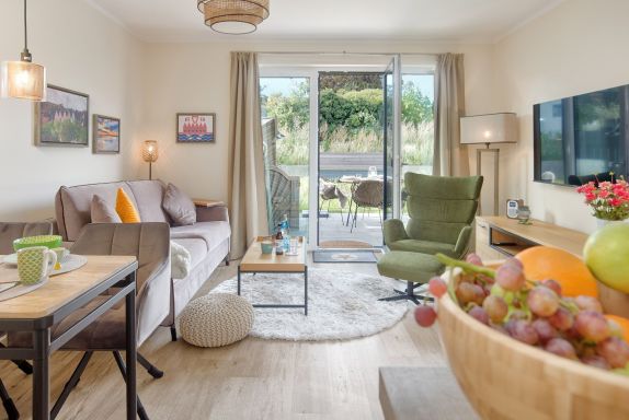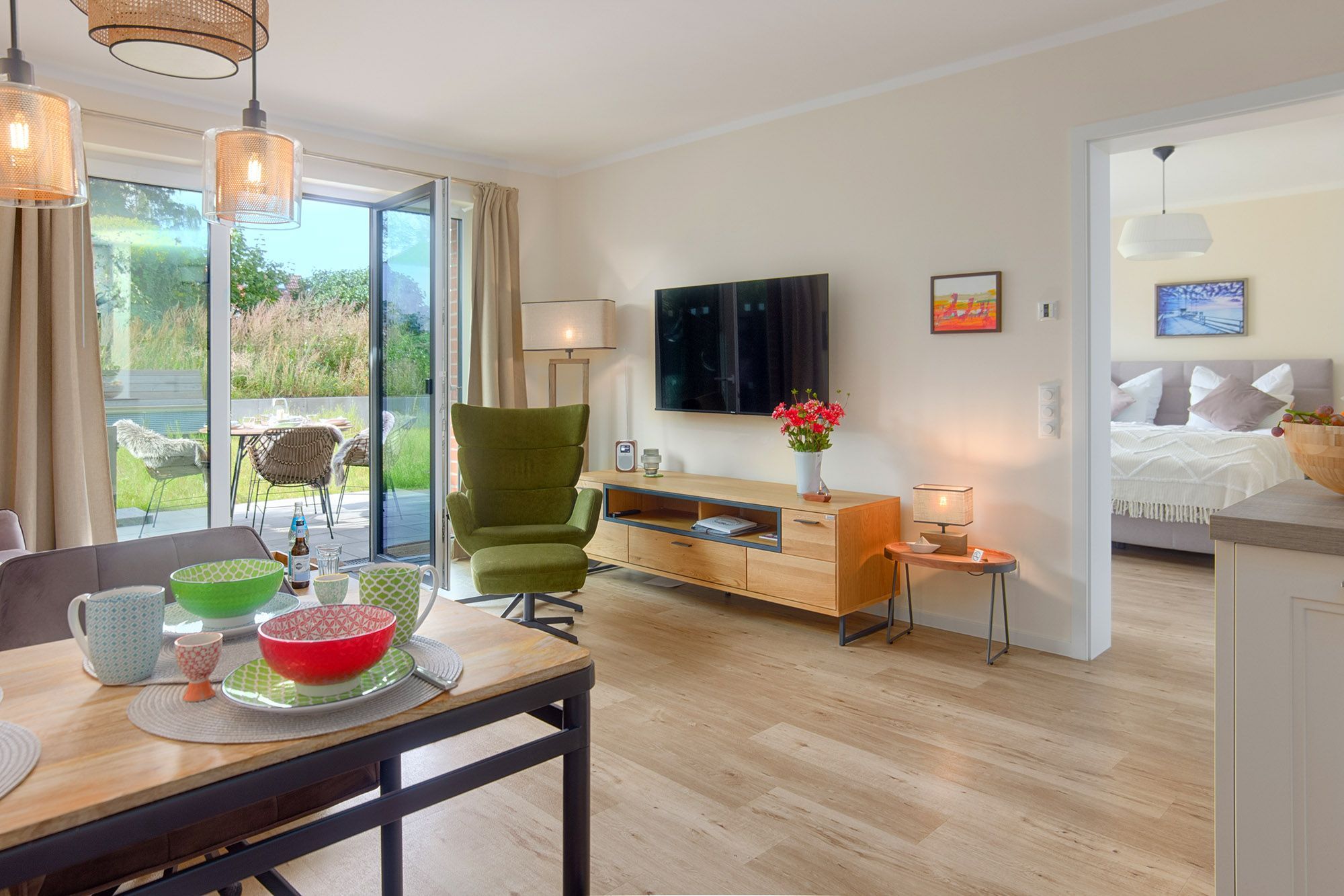 Das Apartment ist hell und freundlich eingerichtet. Auf die einladende West-Terrasse mit einem Strandkorb, Loungemöbeln und einem weiteren Outdoor-Essbereich gelangt man sowohl vom Schlafzimmer als auch vom Wohnzimmer aus. Ein Weber-Gasgrill steht für Grillabende zur Verfügung.