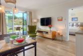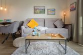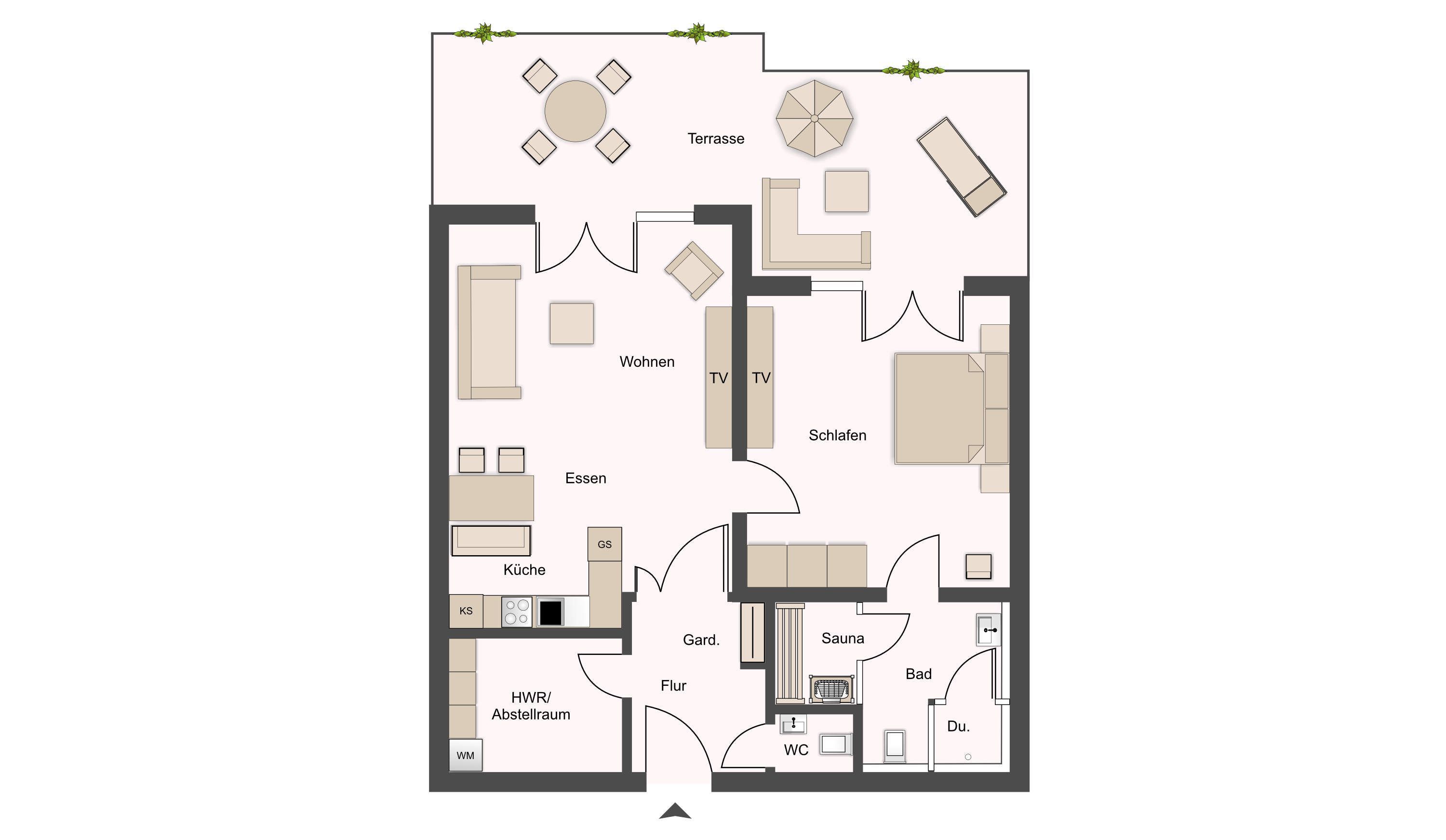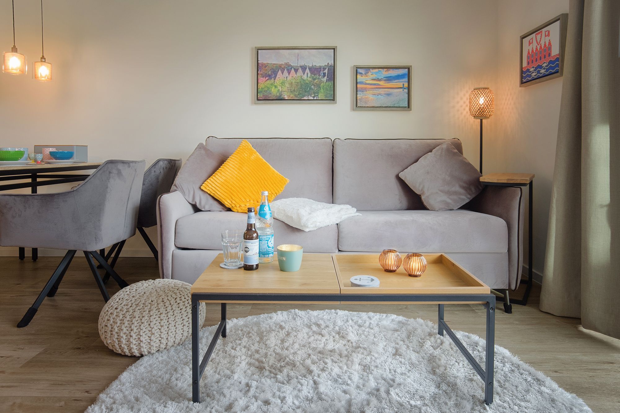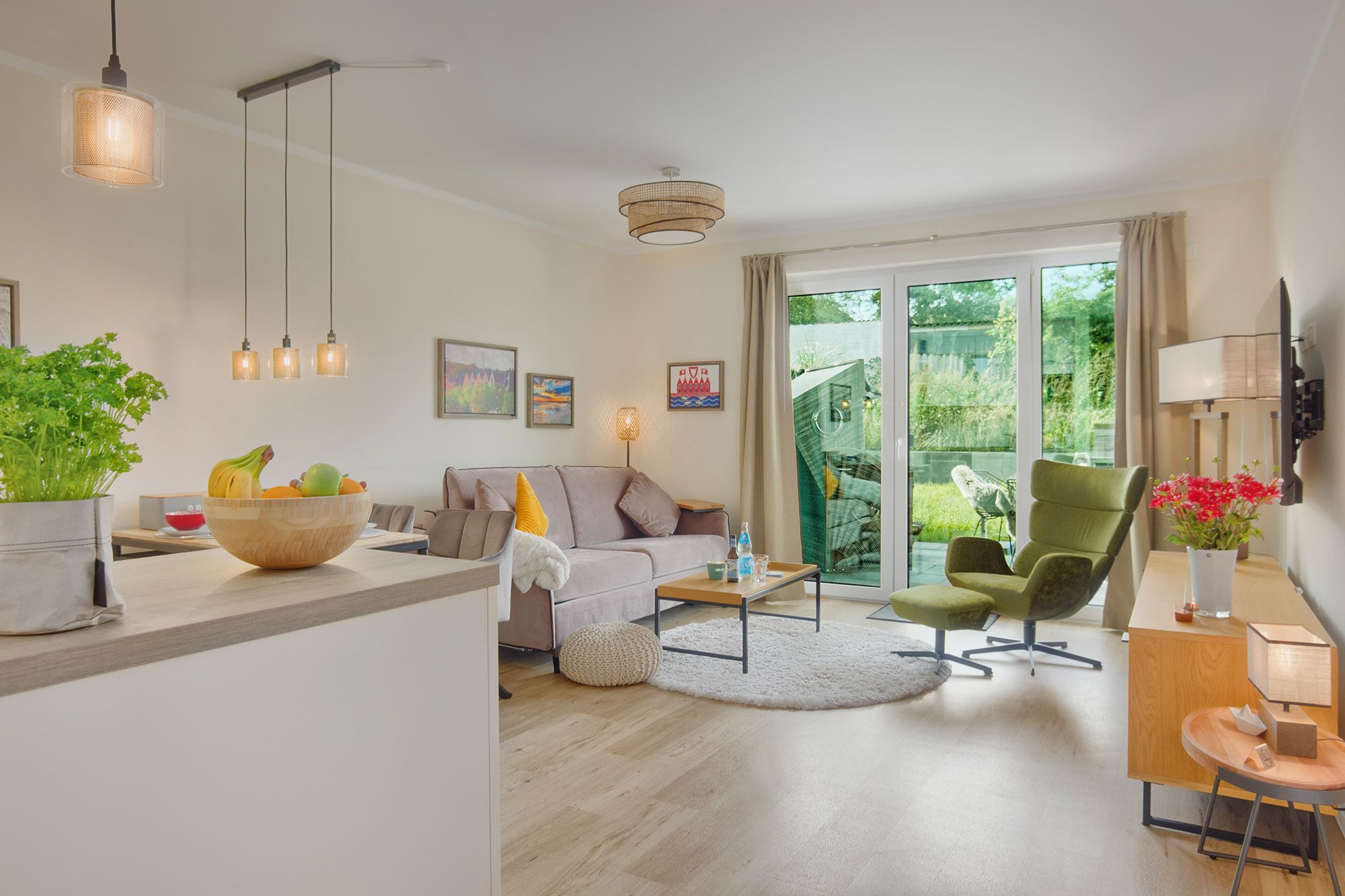 Das Apartment ist hell und freundlich eingerichtet. Auf die einladende West-Terrasse mit einem Strandkorb, Loungemöbeln und einem weiteren Outdoor-Essbereich gelangt man sowohl vom Schlafzimmer als auch vom Wohnzimmer aus. Ein Weber-Gasgrill steht für Grillabende zur Verfügung.